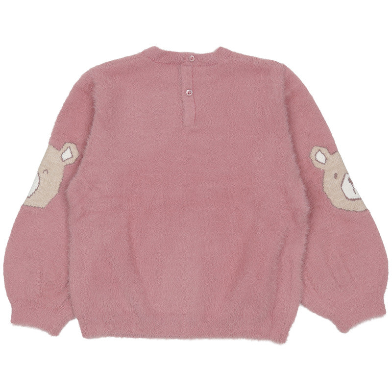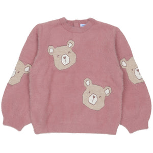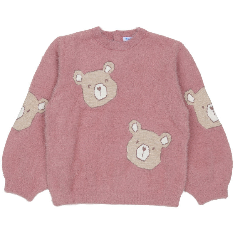 This cozy kid's sweater by Mayoral features a soft, pink eyelash-knit fabric with adorable teddy bear motifs. Its plush texture and relaxed fit ensure warmth and comfort for stylish, everyday winter play.