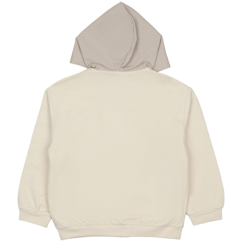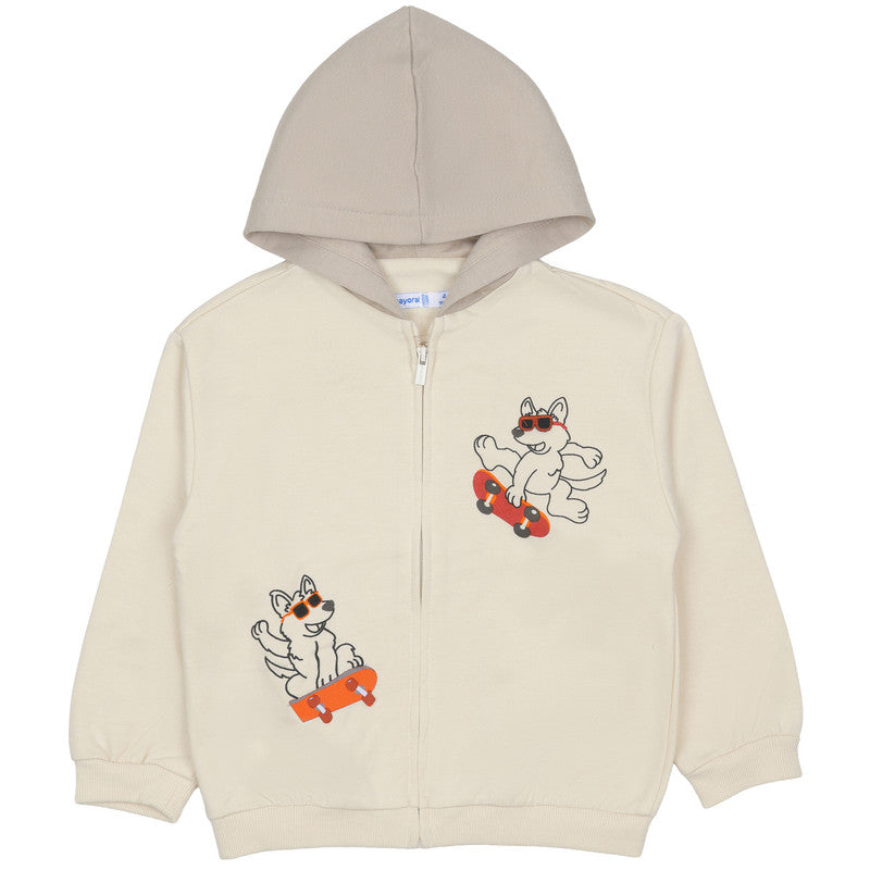 This Mayoral kids' zip-up hoodie features a playful skateboarding dog print on a creamy off-white base. Its contrasting grey hood and ribbed trims provide a sporty, comfortable fit for all-day adventures.