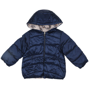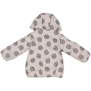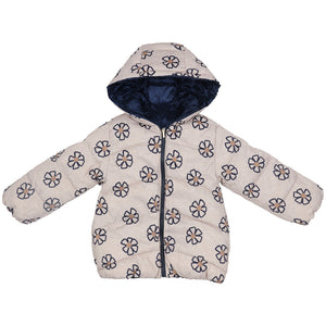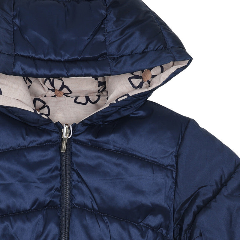 This versatile Mayoral reversible jacket offers two charming looks in one, featuring a playful multicolor flower print on a neutral beige background that flips to a sleek, solid navy quilted side. Designed for winter warmth, it includes a cozy hood, full-length zipper, and padded insulation to keep kids comfortable during any outdoor activity.