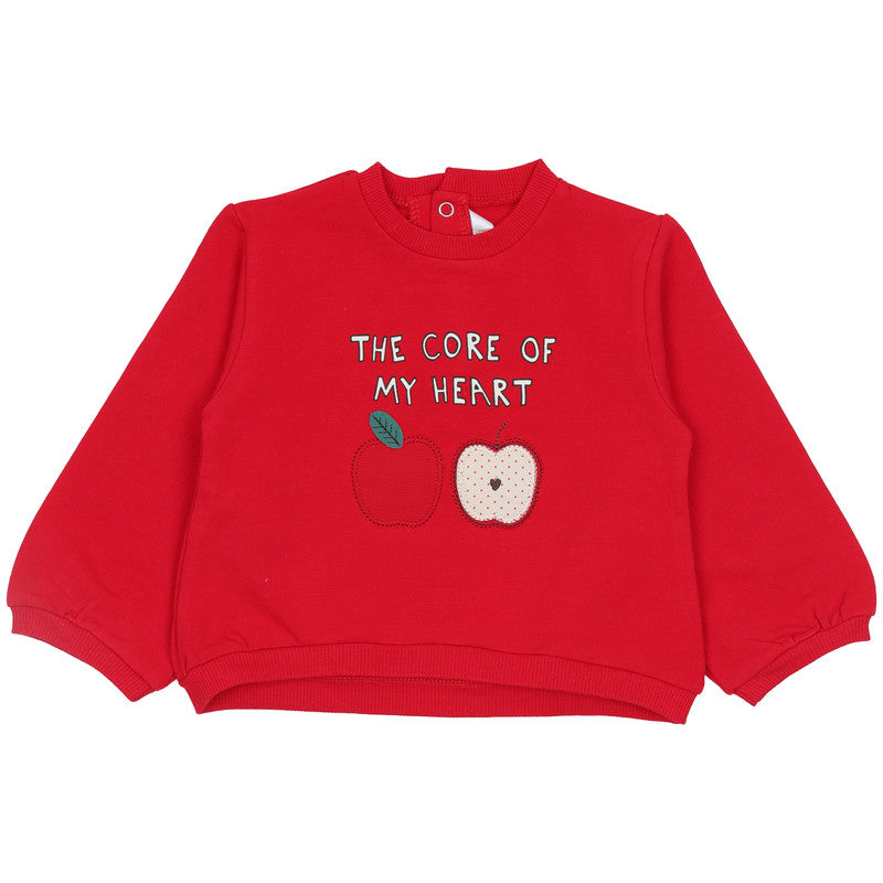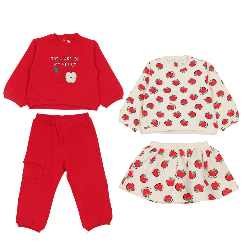 This vibrant Mayoral Multicolor Set offers two distinct outfits in one, featuring a bold red theme and playful apple motifs. The collection includes a solid red sweatshirt with an apple graphic and matching joggers, alongside a cream sweatshirt and skirt set covered in a bright red apple print.