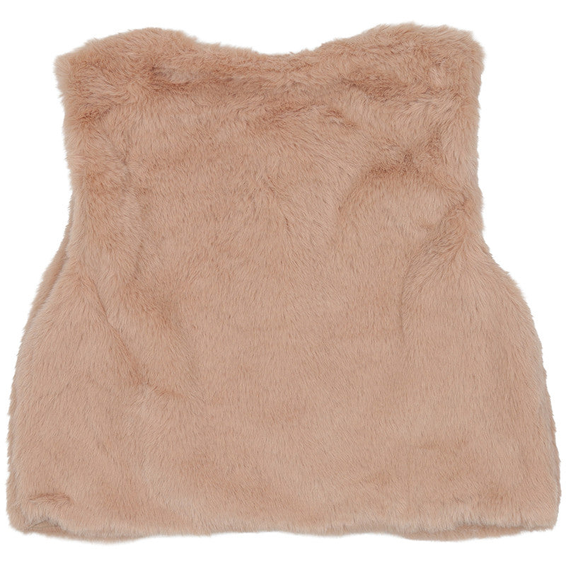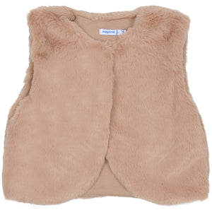 This stylish Mayoral three-piece set for kids combines cozy textures with vibrant floral patterns for a complete winter look. The ensemble features a plush pink faux-fur gilet, a long-sleeved white top, and coordinated floral leggings.