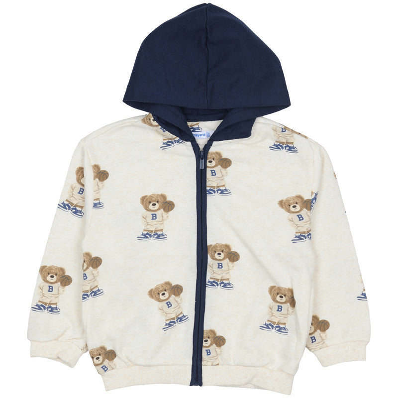 This versatile Mayoral set includes a sleeveless green puffer vest, a beige long-sleeved sweatshirt with a vehicle graphic, and sporty black joggers. It provides practical layering for active kids during chilly winter days.