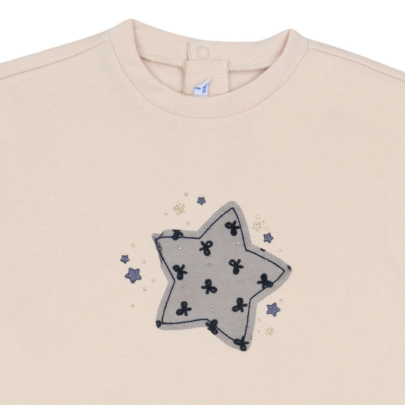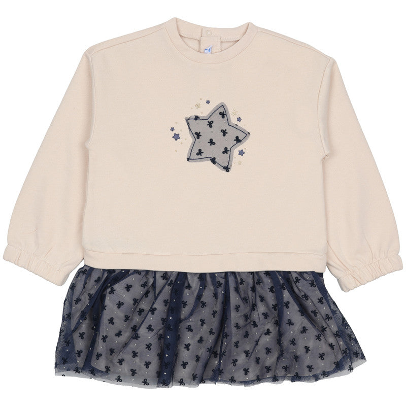 This charming Mayoral Cream Star Embroidery Dress is a sweet and stylish choice for casual everyday wear or special occasions. Designed with a layered look, it combines a soft sweatshirt top with a whimsical tulle skirt.