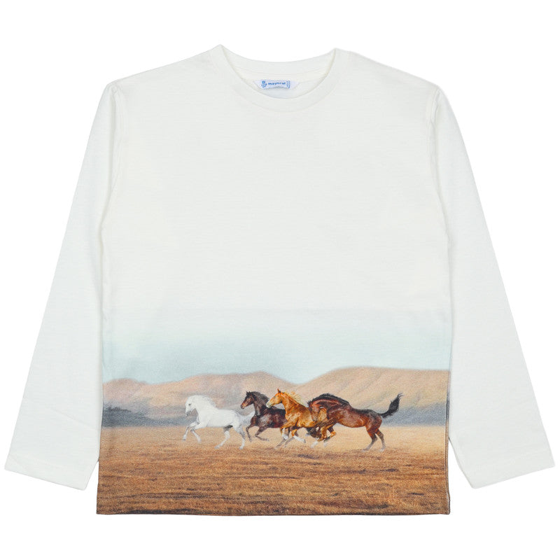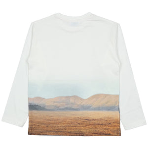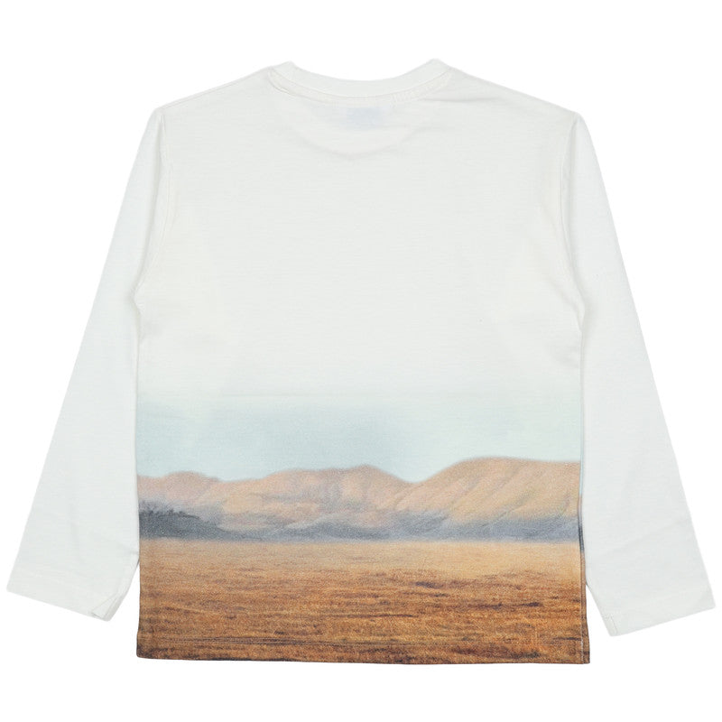 This Mayoral Multicolor T-Shirt features a stunning, high-definition landscape graphic that captures a sense of wild adventure. Designed in a clean cream white, this long-sleeved top is a standout piece for any casual wardrobe.