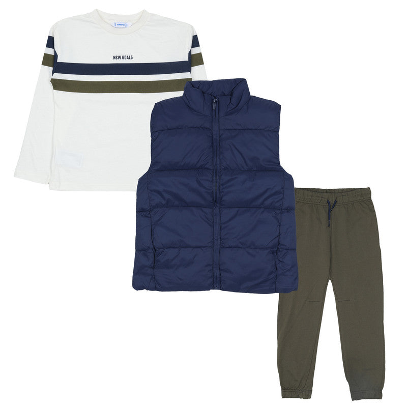 This versatile Mayoral Three-Piece Outfit Set is designed for active comfort and practical layering during the cooler seasons. It includes a puffer gilet, a graphic long-sleeved T-shirt, and coordinated joggers.