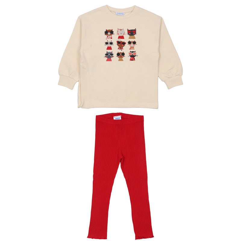 This vibrant Mayoral Multicolor Sweatshirt and Leggings Set is a playful and comfortable outfit choice for everyday wear. The ensemble pairs a detailed graphic top with bright, textured bottoms for a standout look.