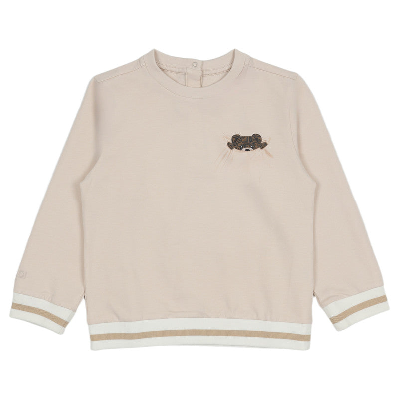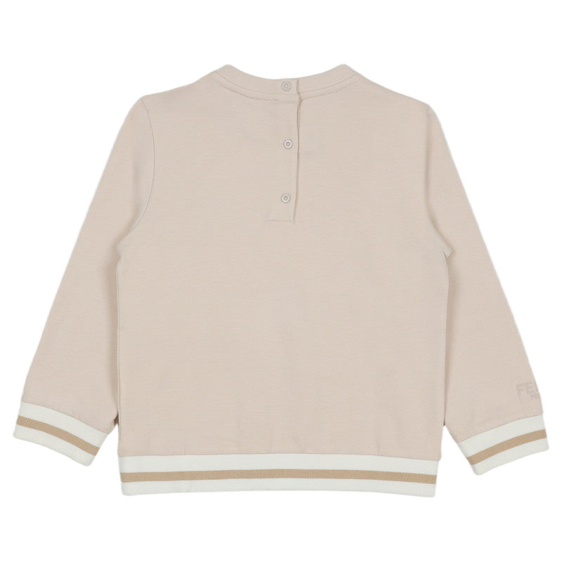 Beige sweatshirt by luxury brand Fendi, made in soft cotton jersey. Combining playful charm with comfort, it has a delightful Fendi bear motif on the chest and signature Fendi Roma embroidery on one sleeve. There are sporty striped trims and useful popper fastenings on the back to help with dressing.
