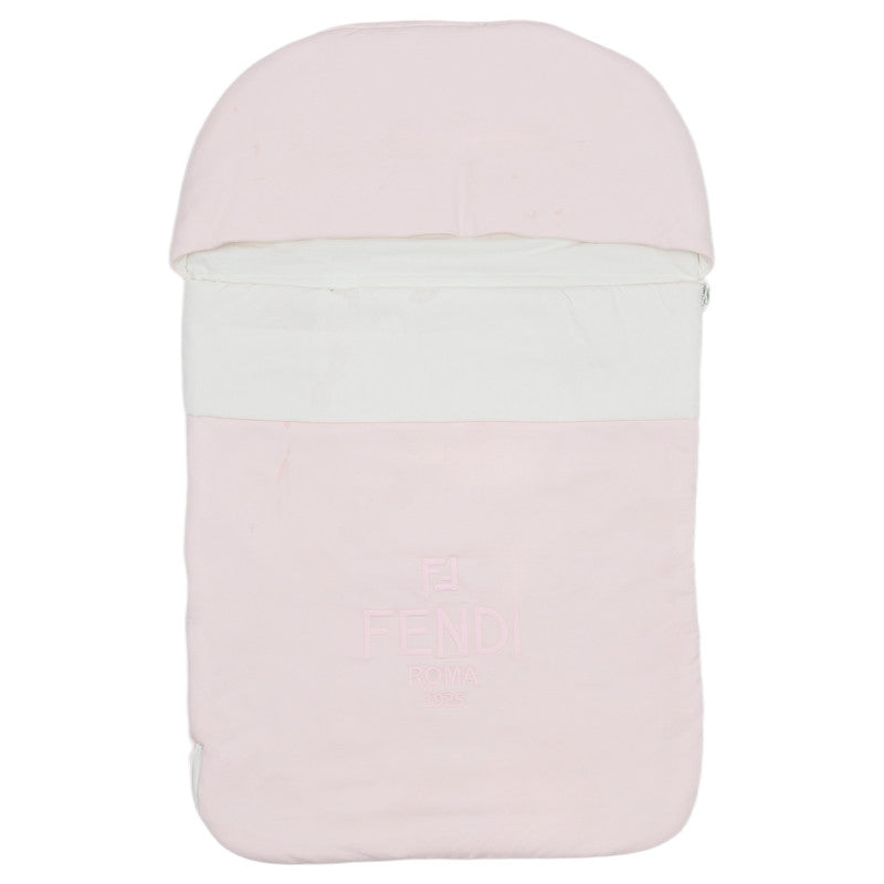 An essential pink Fendi baby nest for comfort and style. Features a zip opening, a white stripe accent, and an embroidered Fendi Roma logo.