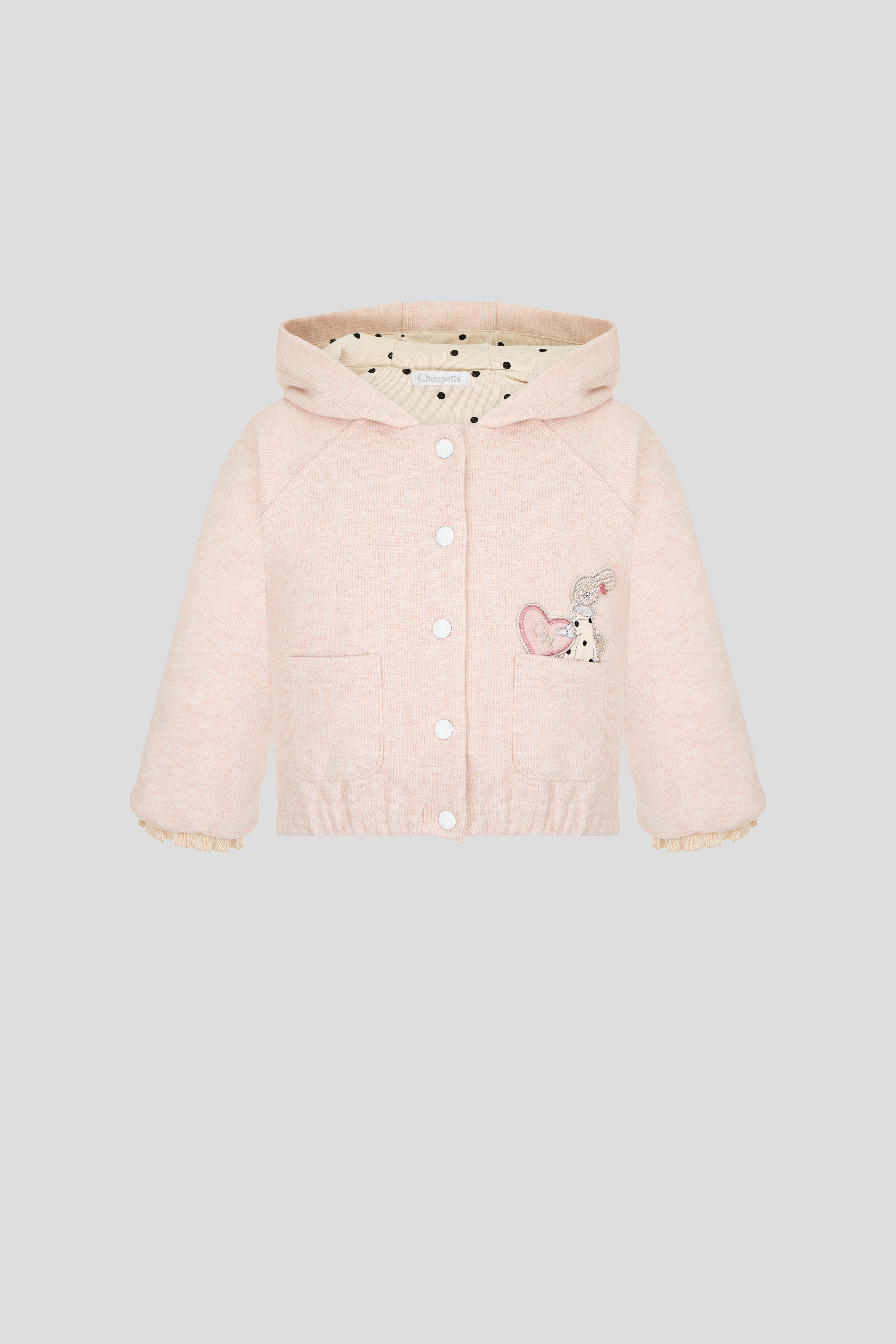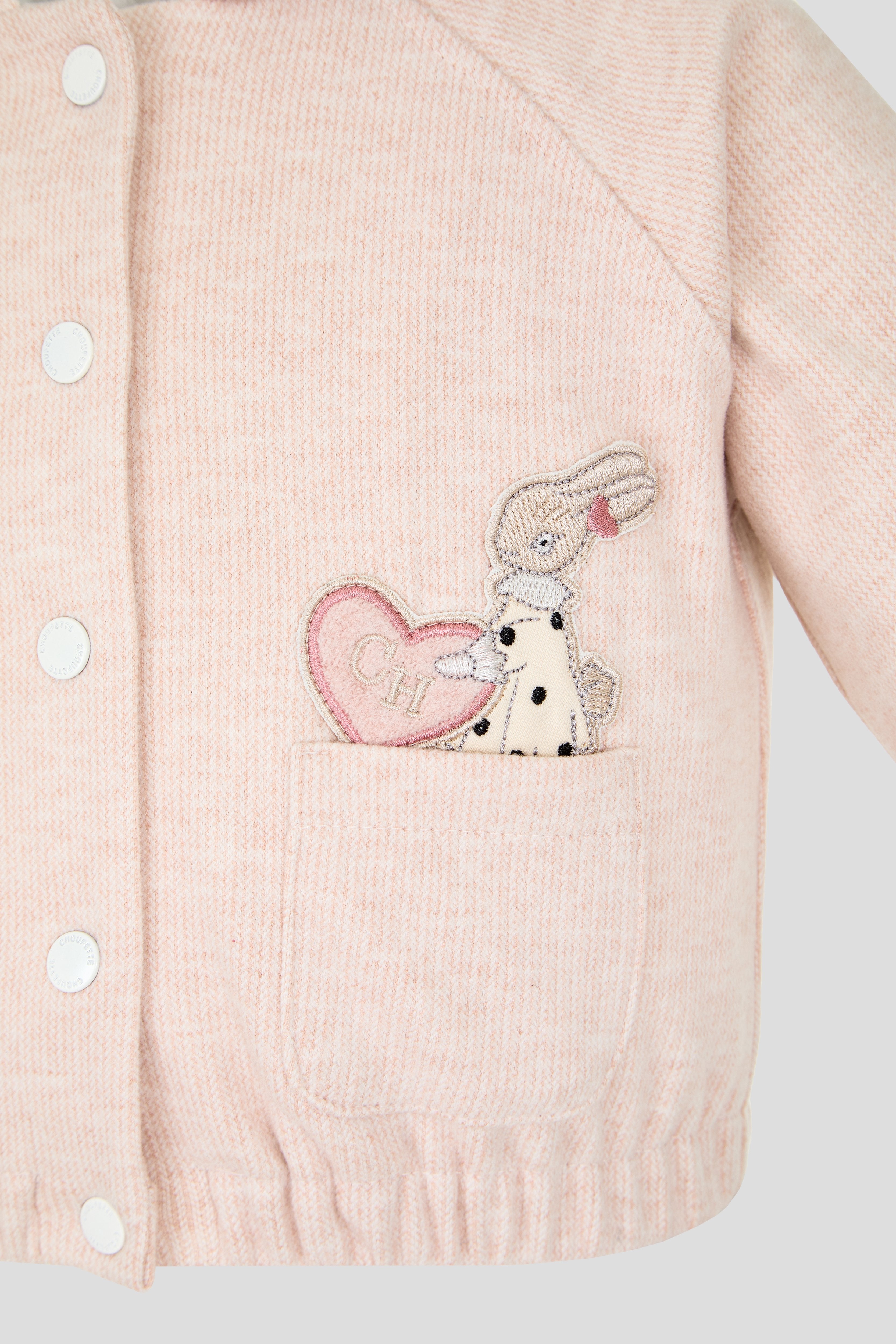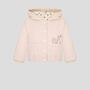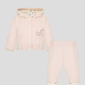 This elegant jersey tracksuit set for baby girls includes a stylish bomber jacket and matching pants, featuring a charming bunny detail. Crafted from soft, breathable fabric, it ensures comfort and flexibility for little ones while offering a refined look. Perfect for everyday wear or special outings, this set combines practicality with gentle sophistication.