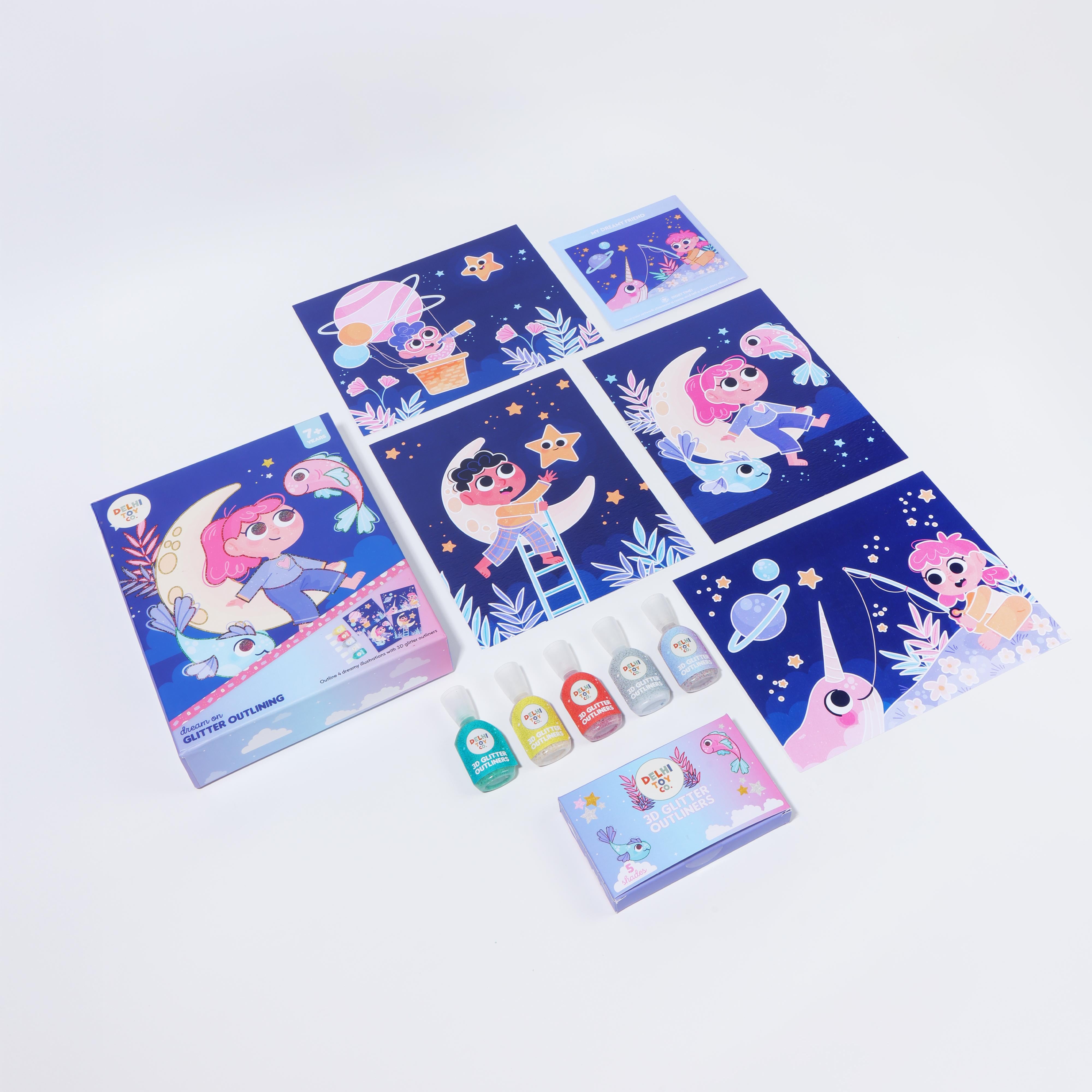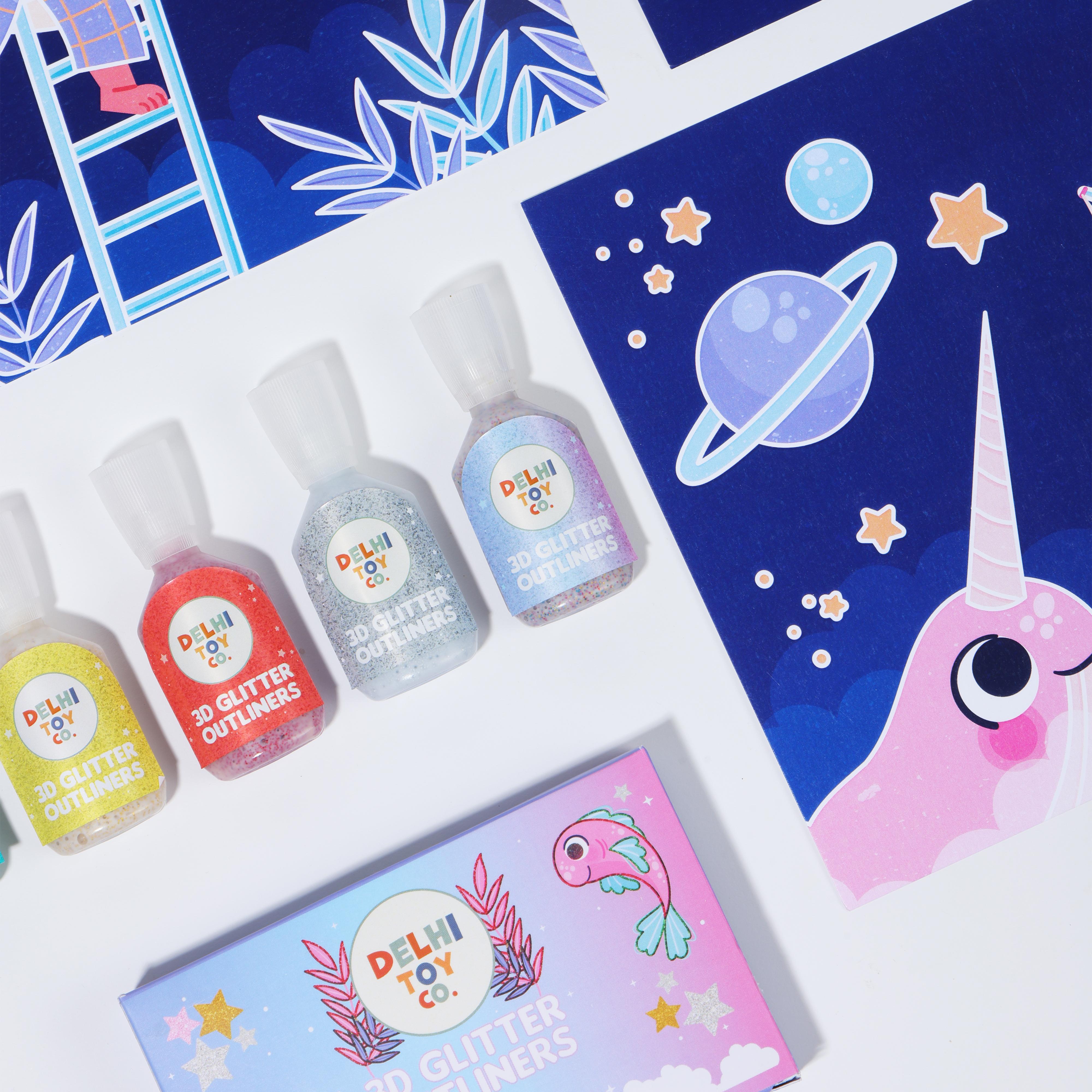Outline the magic, shine in every line! Bring sparkle to every stroke with 4 dreamy illustration cards waiting to shine. Use 5 glitter 3D outliner tubes in rich hues to trace, decorate, and dazzle. Each squeeze adds shimmer and texture, turning every outline into a glowing masterpiece
