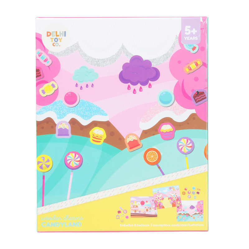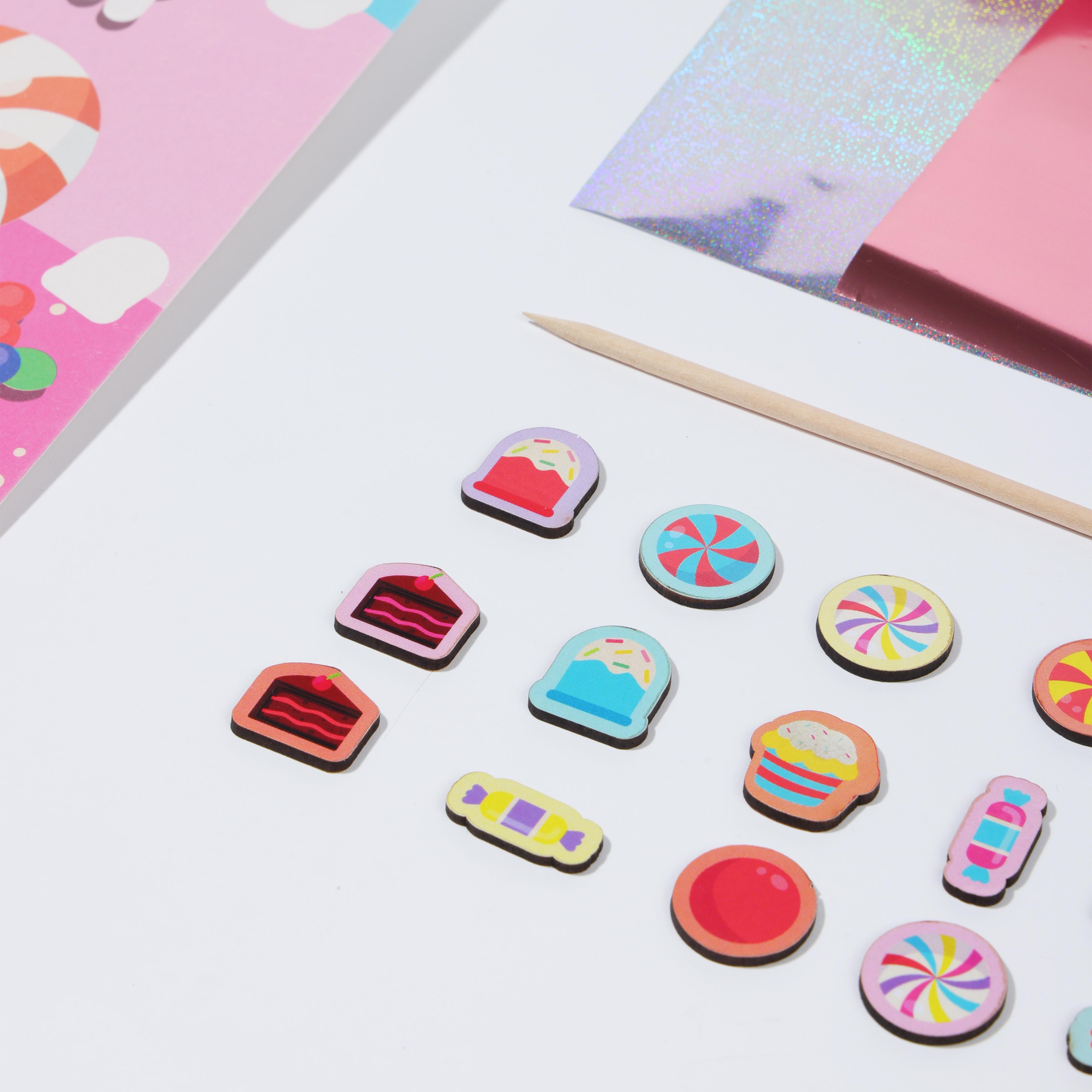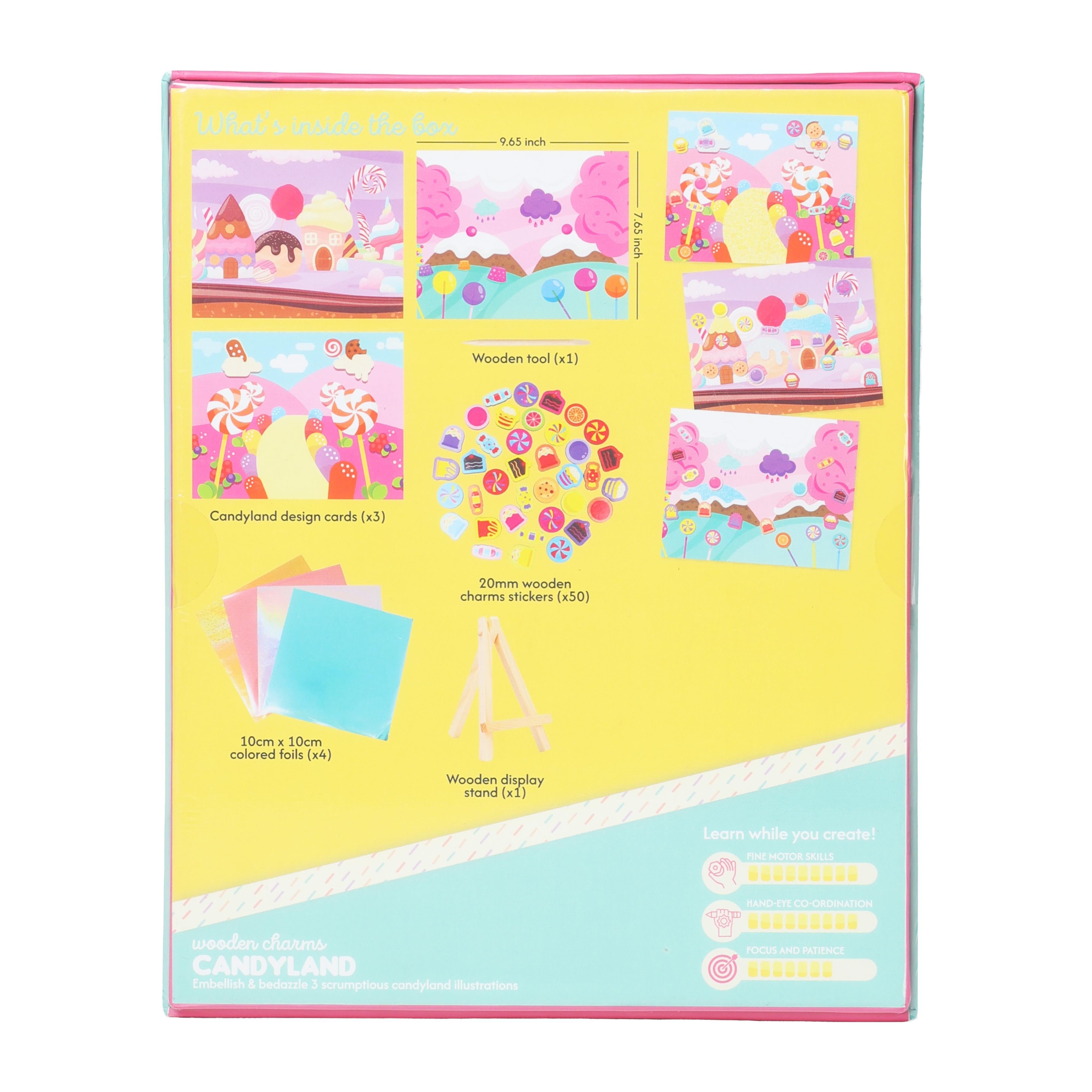 Create your own scrumptious Candyland art with wooden charms and shiny foil sheets! Craft three delicious illustrations using four colourful foils and a bagful of wooden cutouts like cake slices, muffins, lollipops and so much more!