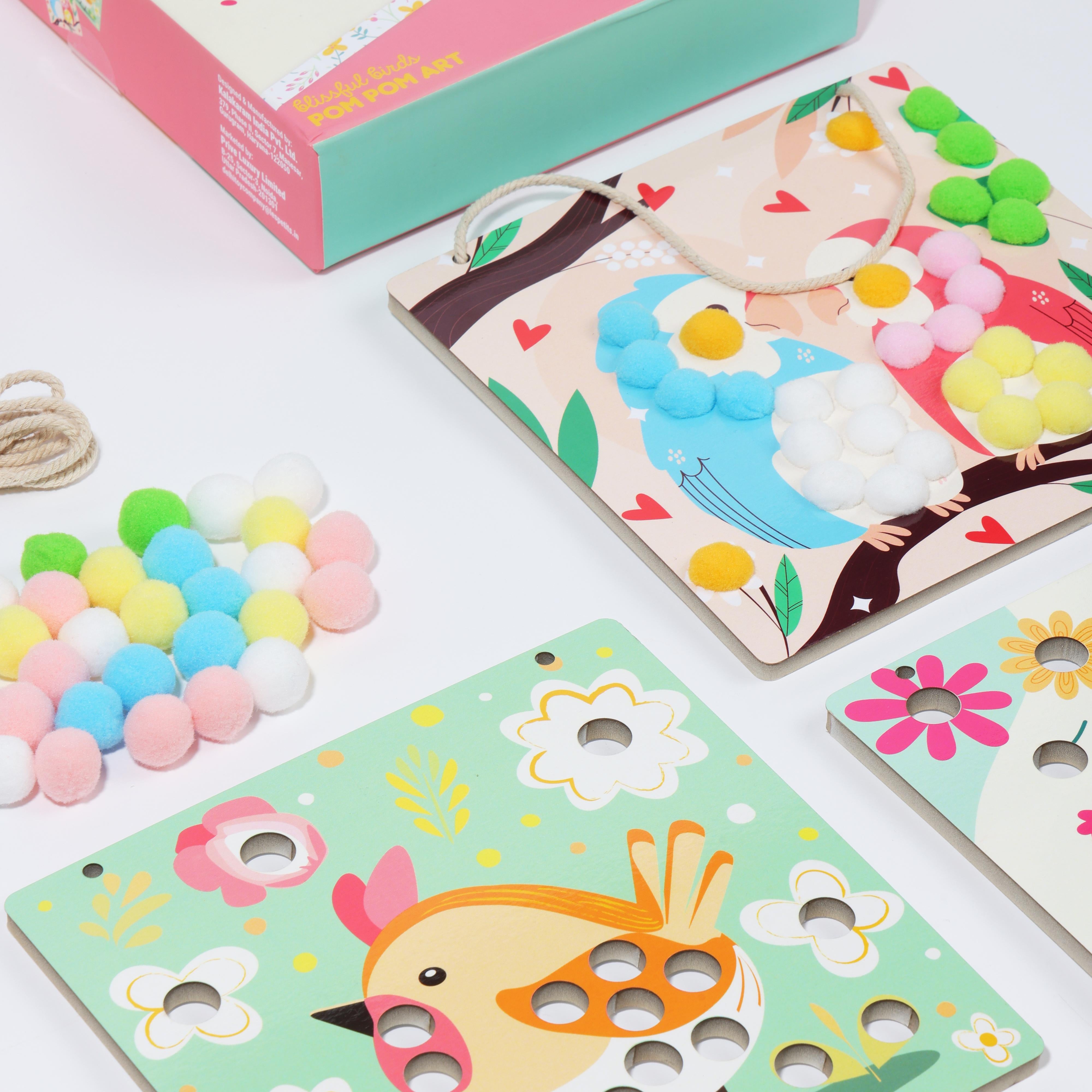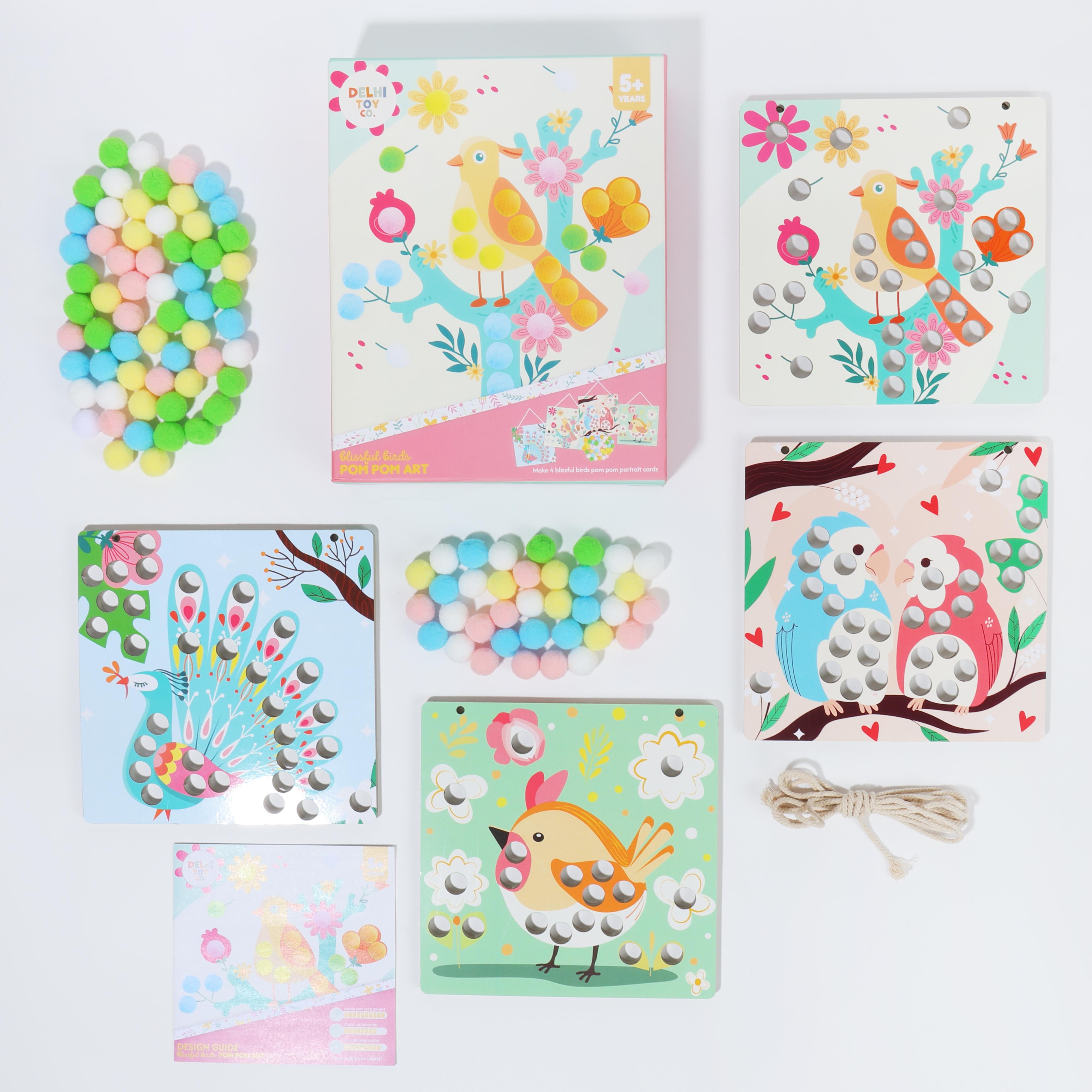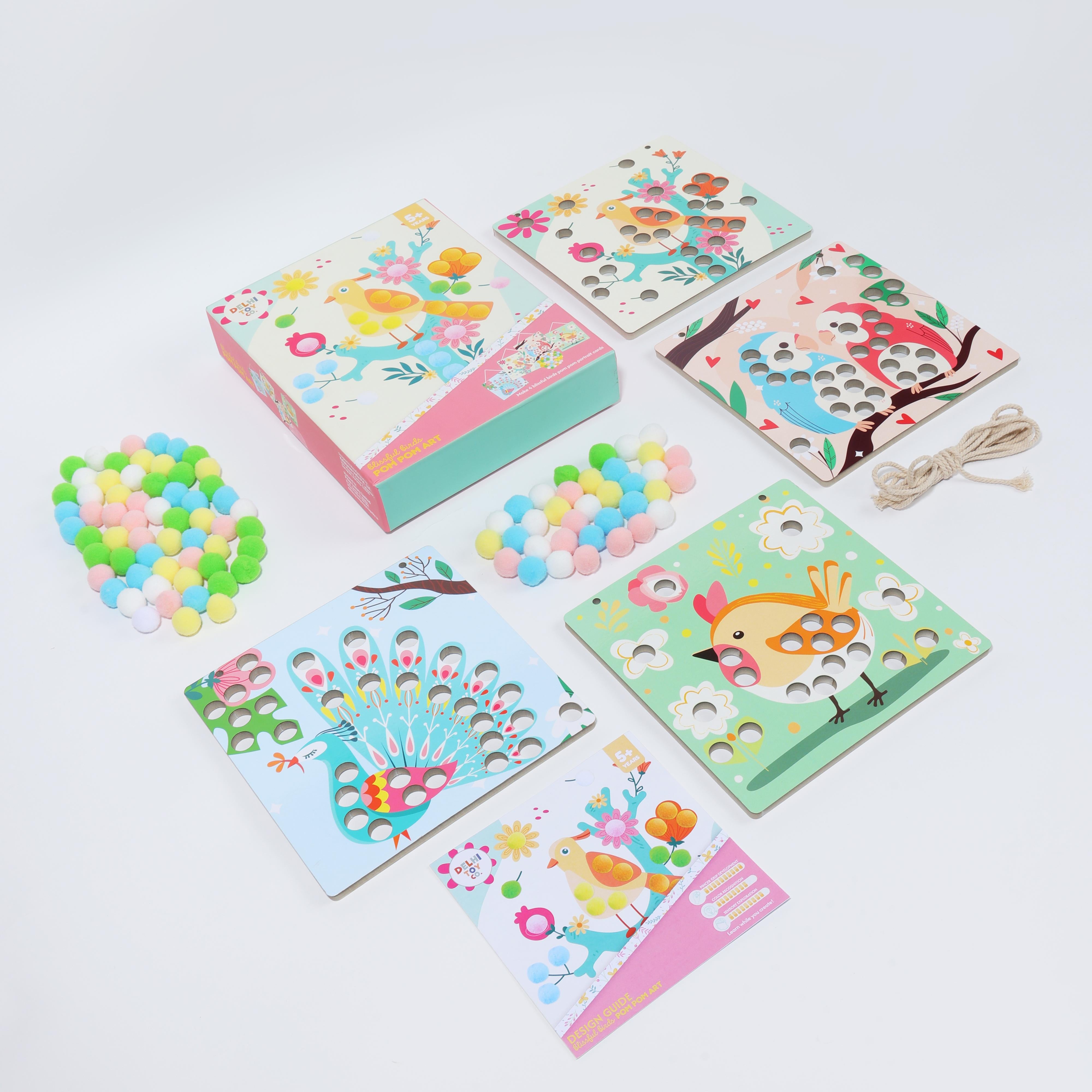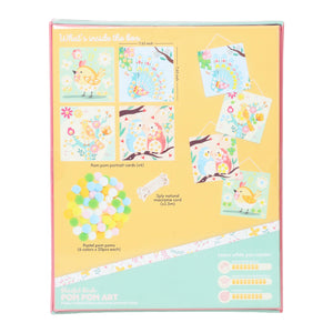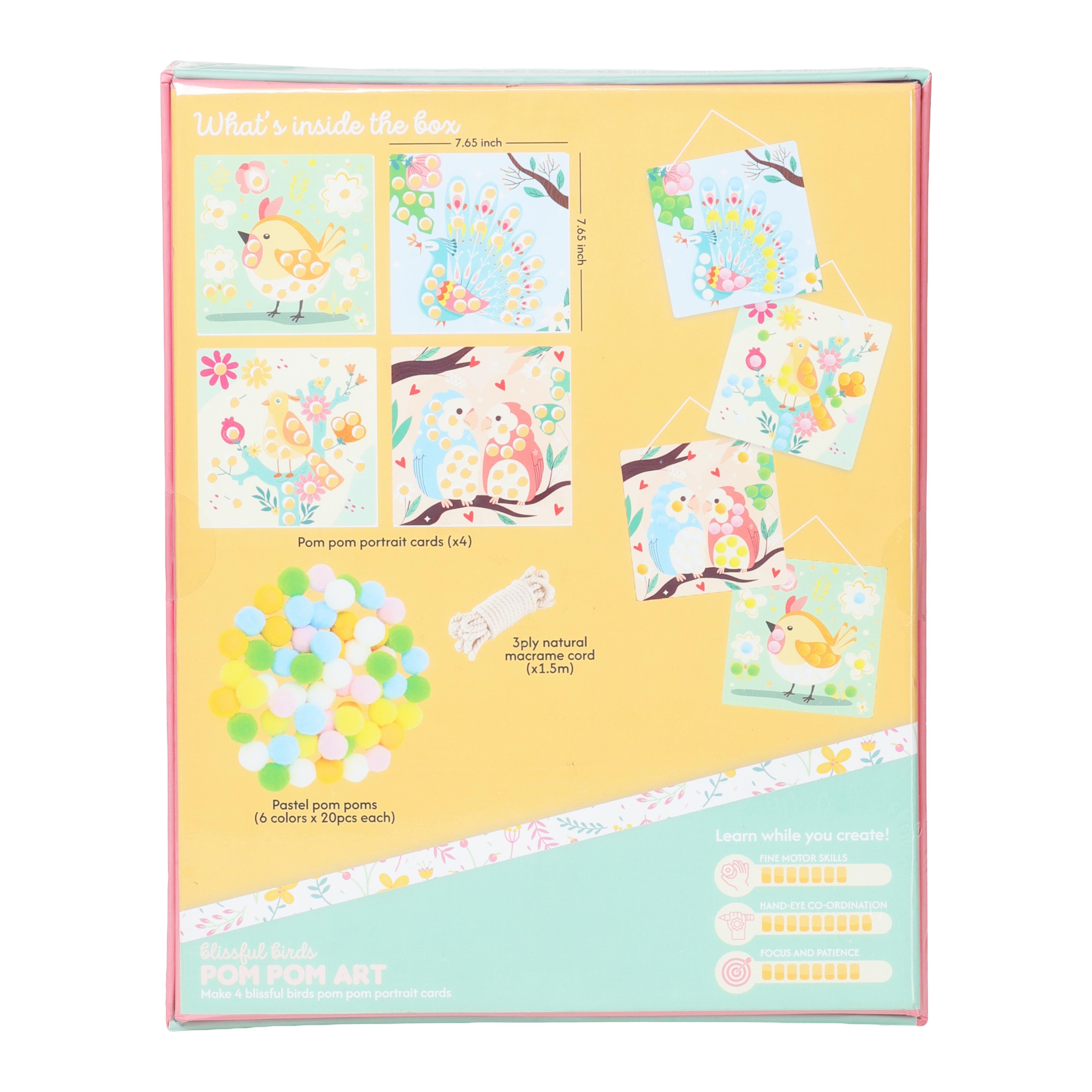 Make four cheerful bird portrait cards using a bundle of colourful pastel pom poms. Add a pop of fun, a touch of fluff, and complete each artboard before hanging your creations with the roll of string included. A delightful craft to brighten any space!