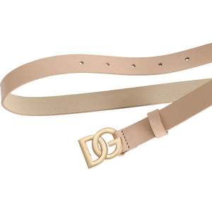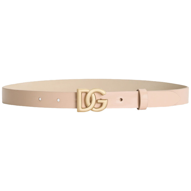 Stylish peach patent leather belt by luxury Italian brand Dolce & Gabbana. Adding an elevated finishing touch to an outfit, this classic accessory has a gold DG logo pin buckle for a signature look.