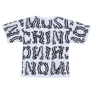 This Is A Moschino T-Shirt Featuring A Unique All-Over Print. The Short-Sleeve, Crewneck T-Shirt Is White And Covered With A Bold Black And White Print. The Print Consists Of The "Moschino" Logo Stylized To Look Like Twisting, Ribbon-Like Letters, Creating A Dynamic And Eye-Catching Pattern Across The Entire Shirt. This Design Is A Modern And Graphic Take On A Brand-Name Item.