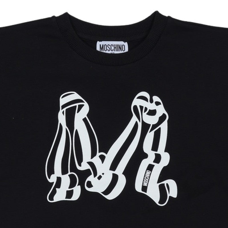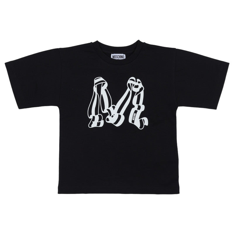 This Stylish Black T-Shirt From Moschino Is A Playful And Modern Staple For Your Child'S Wardrobe. Made From Soft, Comfortable Cotton, It Features A Unique White Ribbon Print That Forms A Large "M" On The Front. With Its Classic Crew Neck And Short Sleeves, This Top Is Perfect For Everyday Wear And Adds A Touch Of Designer Flair To Any Casual Outfit.