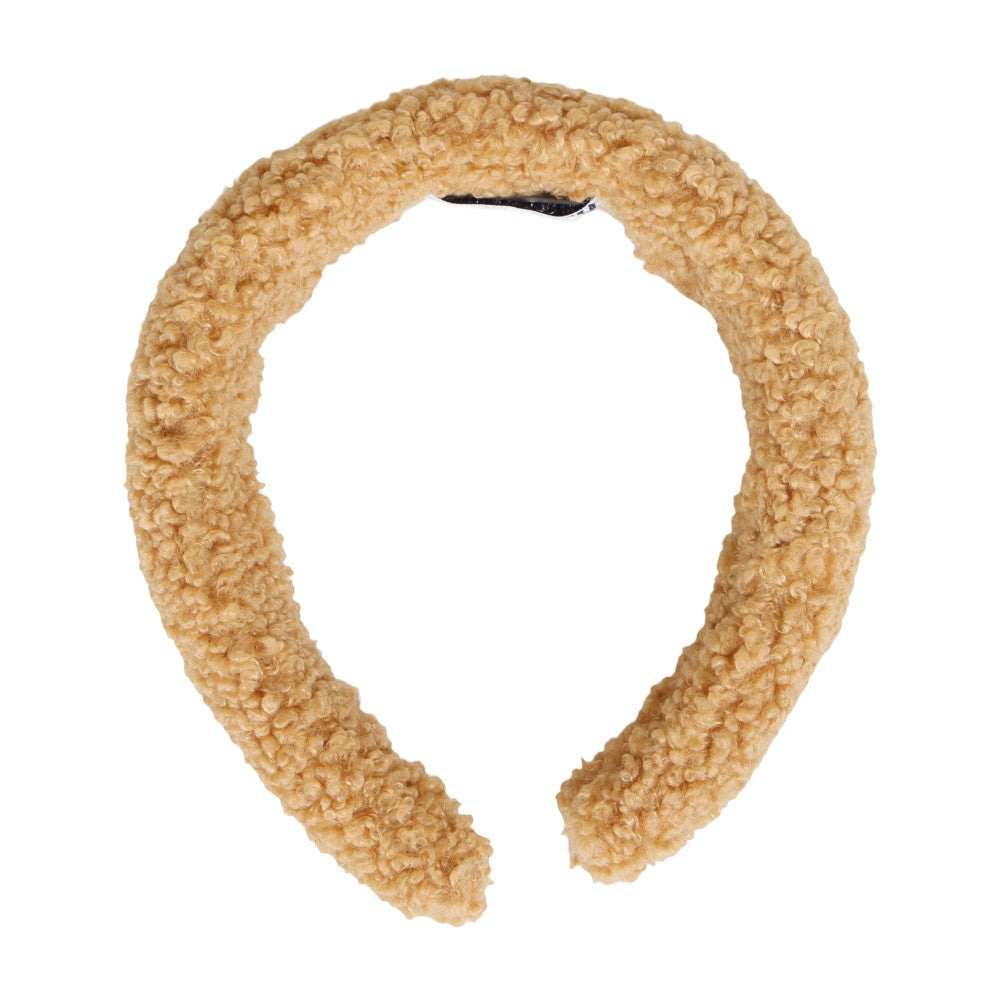 A Cozy And Stylish Headband By Moschino In A Warm Camel-Colored Teddy Borg/Sherpa Fleece. The Piece Features A Voluminous Padded Design For A Fashionable Silhouette And Ultimate Comfort, With The Moschino Logo Printed In Black On The Side. Perfect For Adding A Soft, Textured Accent To Your Winter Look.