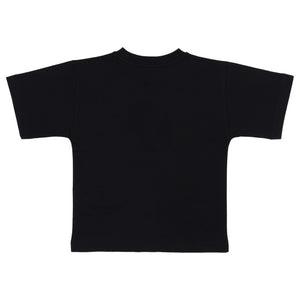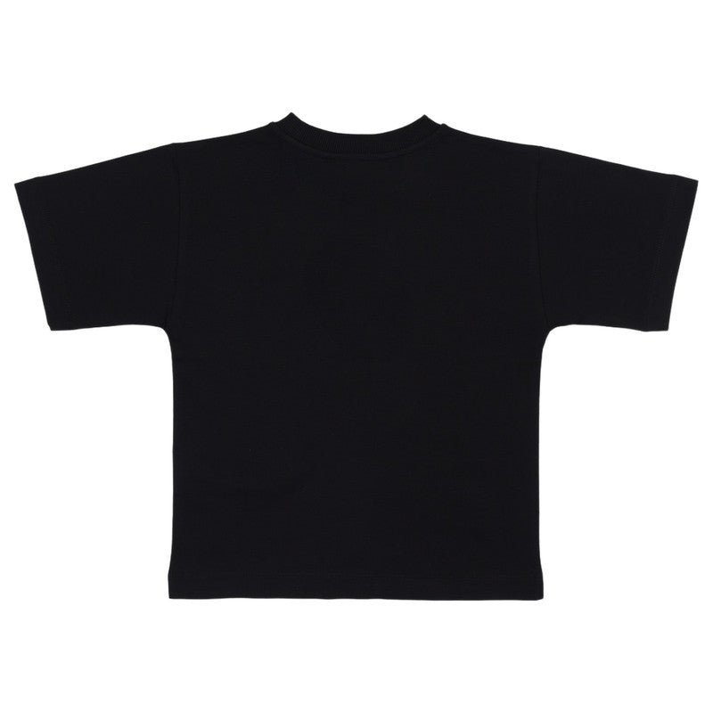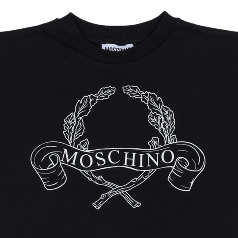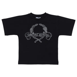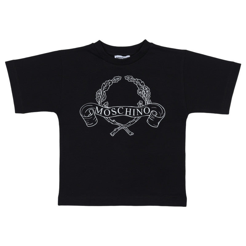 This Bold Black T-Shirt From Moschino Is A Classic And Comfortable Piece For Any Child'S Wardrobe. Made From Soft Cotton, It Features A Striking White Wreath And Ribbon Logo Print Across The Chest. The Wide Crew Neck And Short Sleeves Offer A Relaxed Fit, Making It Perfect For Everyday Wear.