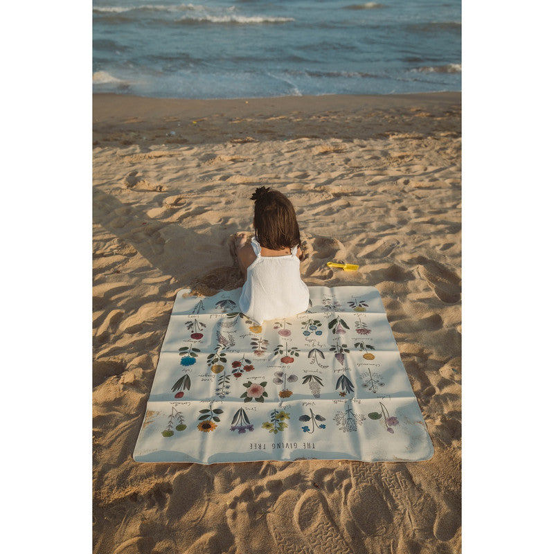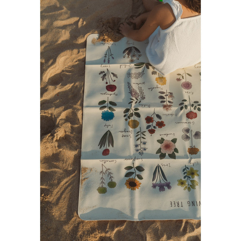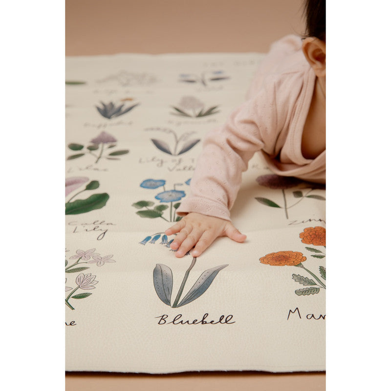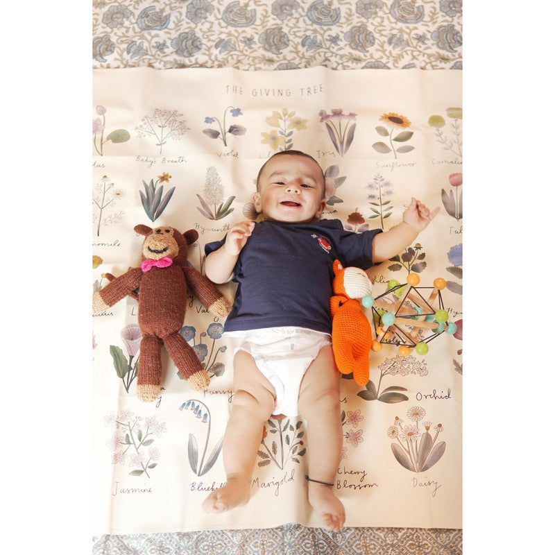 Ethically crafted with sustainable materials. Vegan leather made from fruit skin and cork. Water and stain-resistant. PVC and lead-free. Baby-safe and GOT certified. Large multi-purpose mat supporting play, meals, and creativity. Giving Tree theme encourages mindfulness and kindness.