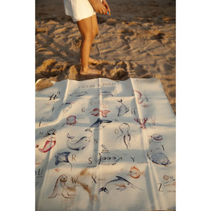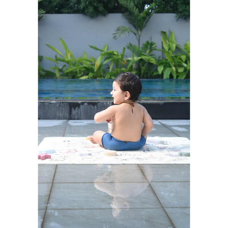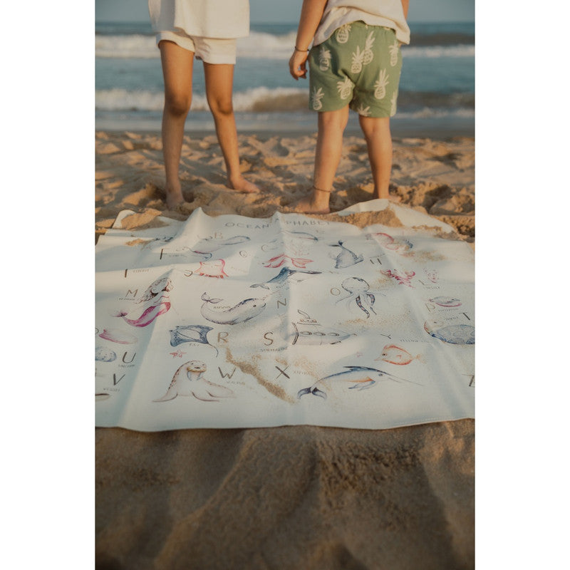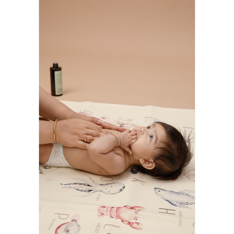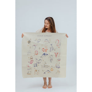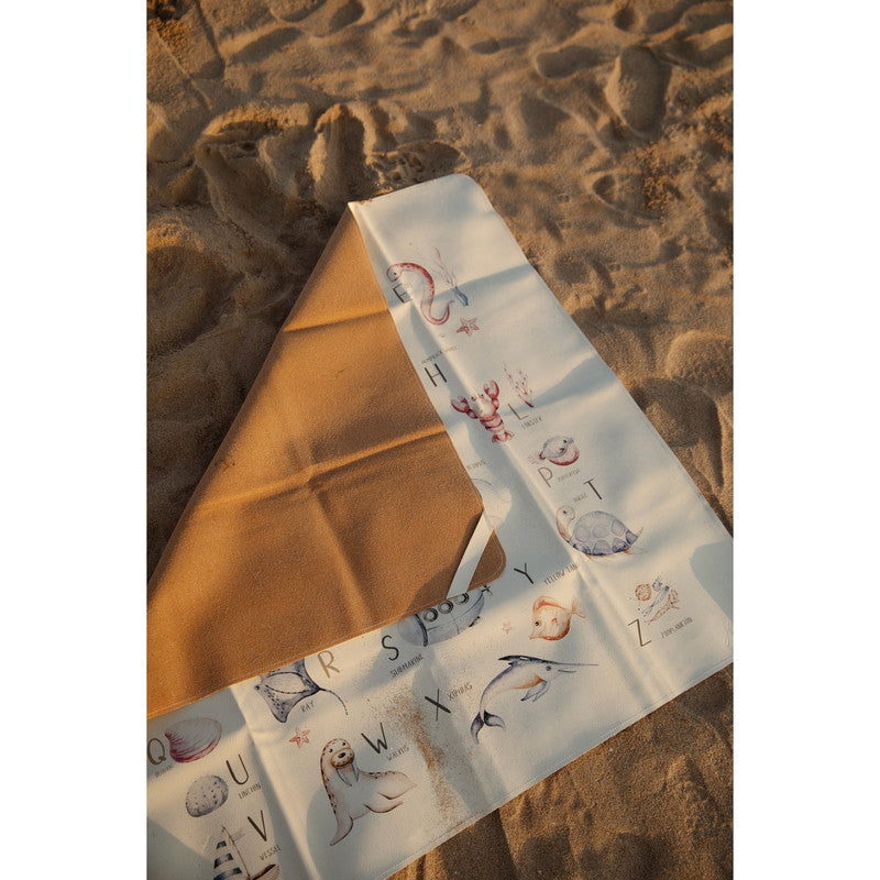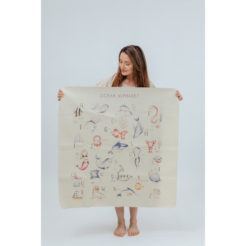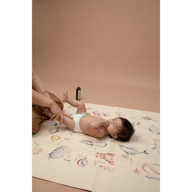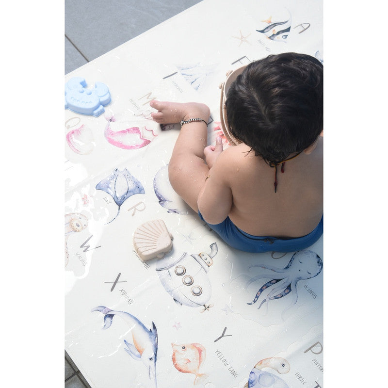 Ethically crafted with premium vegan leather. Sustainable fruit-skin composition. Water and stain-resistant. PVC and lead-free. Baby-safe and GOT certified. Spacious mat for play, feeding, and learning. Ocean alphabet theme promotes curiosity and discovery.