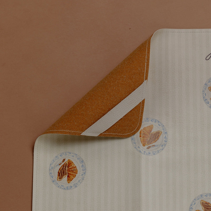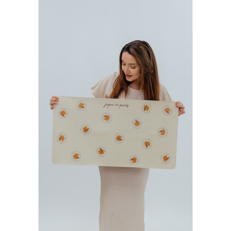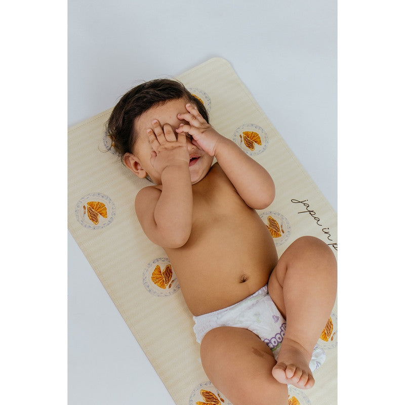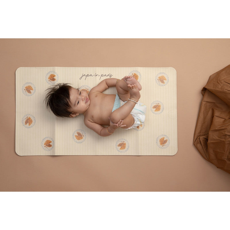 Ethically crafted with a premium feel. Sustainable vegan leather composition. Water and stain-resistant. PVC and lead-free. Baby-safe and GOT certified. Compact and versatile for diaper changes, feeding, or play. Paris-inspired design adds a chic touch.