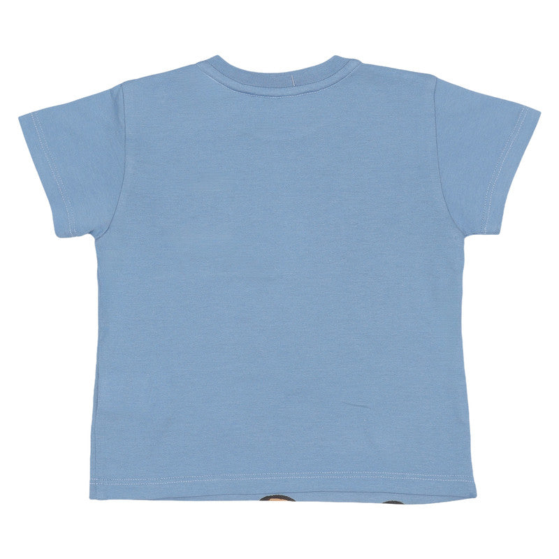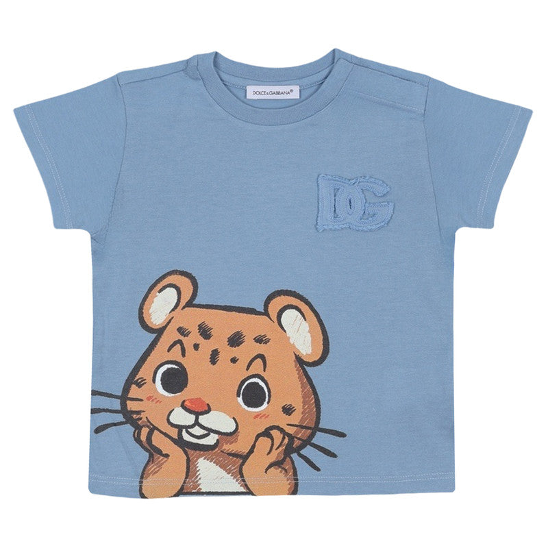 A blue cotton T-shirt by Dolce & Gabbana, featuring a cute baby leopard design on the front. A tonal, frayed-edge DG logo is appliquéd on the chest, adding a luxurious finishing touch.