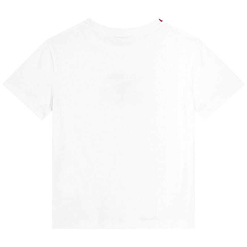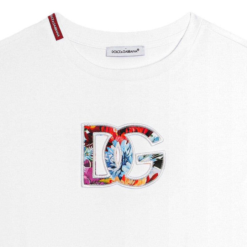 White cotton T-shirt for girls by luxury label Dolce & Gabbana, with a colourful, floral DG logo appliqué on the front for instant designer appeal. Made in soft jersey, this charming, casual style has short sleeves and a crew neckline, trimmed with a red logo for an extra branded touch.