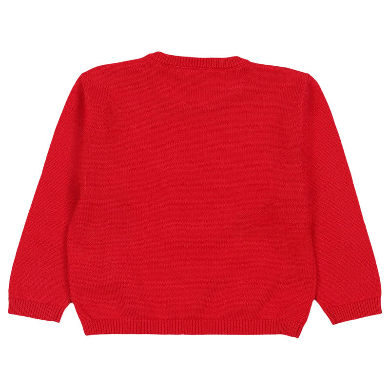 Get ready for the festive season with this adorable red knit sweater. It features a fluffy white polar bear appliqué wearing a plaid scarf, complete with shoulder snaps for easy dressing. Perfect for keeping warm and cheerful.