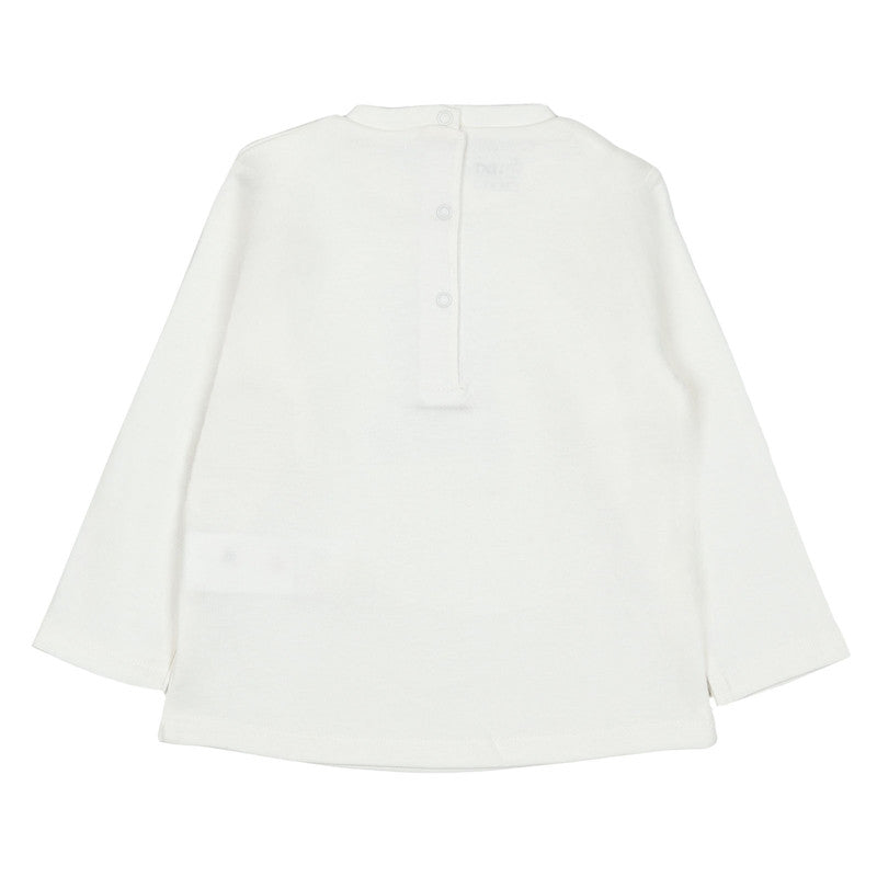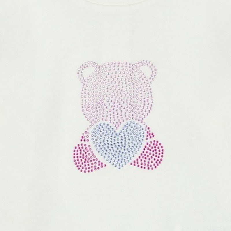 This soft, ivory long-sleeve top is detailed with an adorable bear graphic made of shimmering pink, purple, and blue rhinestones holding a heart. Perfect for adding a touch of sparkle and love to any outfit.