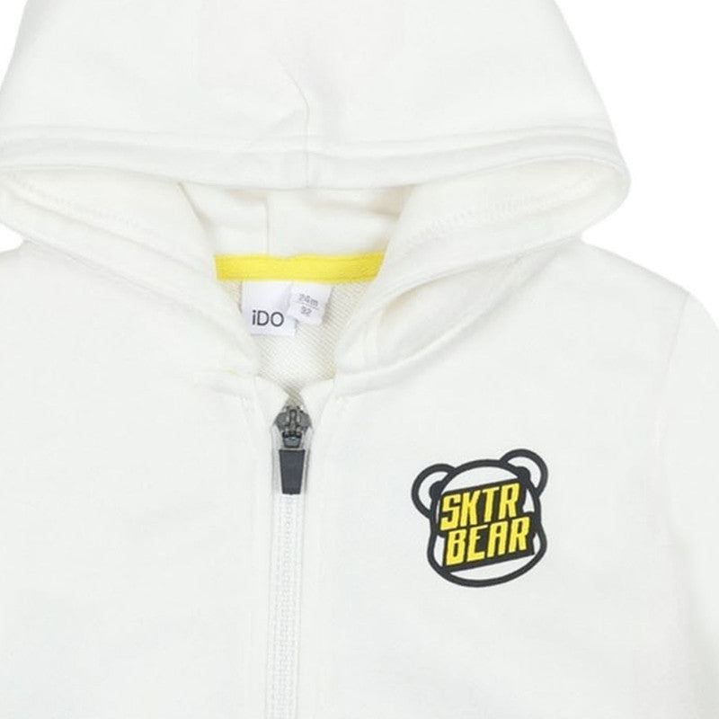 Keep them cozy and cool with this IDO white zip-up hoodie. Featuring a fun 'SKTR BEAR' graphic on the chest and contrasting yellow accent labels, this soft fleece jacket is perfect for everyday active wear.