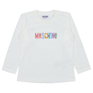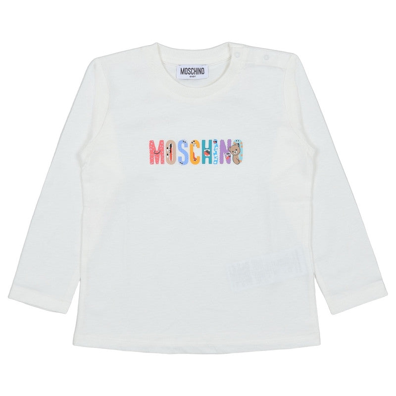 This Crisp Moschino Long-Sleeve T-Shirt In Ivory Features A Fun, Colorful Logo Where Each Letter Is Creatively Illustrated With The Moschino Teddy Bear And Friends. A Playful Cotton Essential.