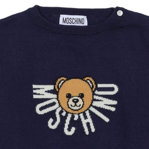 Keep Them Cosy In This Navy Blue Moschino Kids Sweater. It Features A Soft Knit And A Striking Intarsia-Knit Teddy Bear Face Surrounded By The Moschino Logo On The Chest.