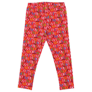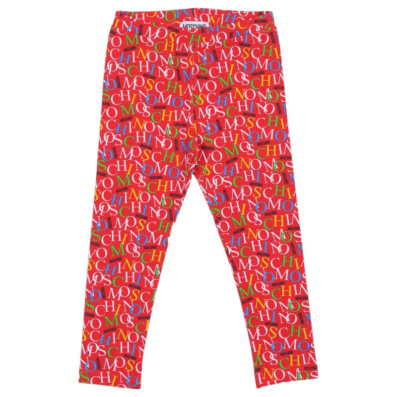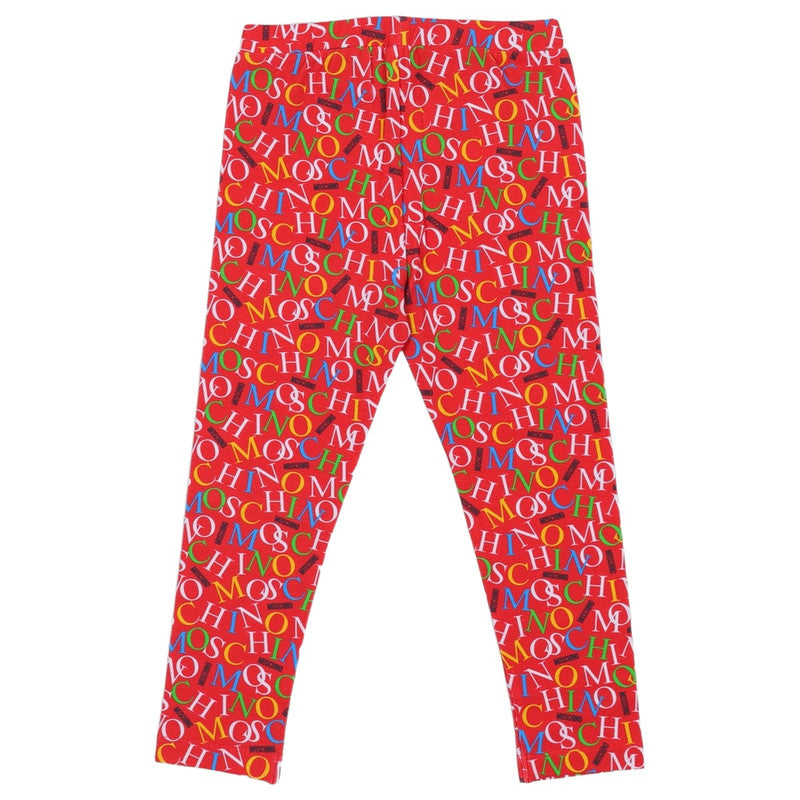 This Is A Two-Piece Children'S Outfit By Moschino, Featuring A White Long-Sleeve Top And Red Leggings. The Top Has A Colorful Moschino Logo On The Chest With A Teddy Bear Replacing The "O". The Leggings Have A Vibrant, All-Over Print Of The Brand'S Logo.
