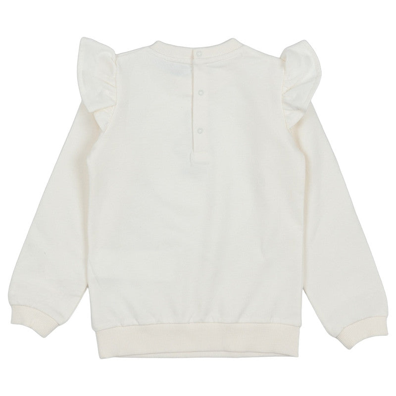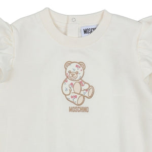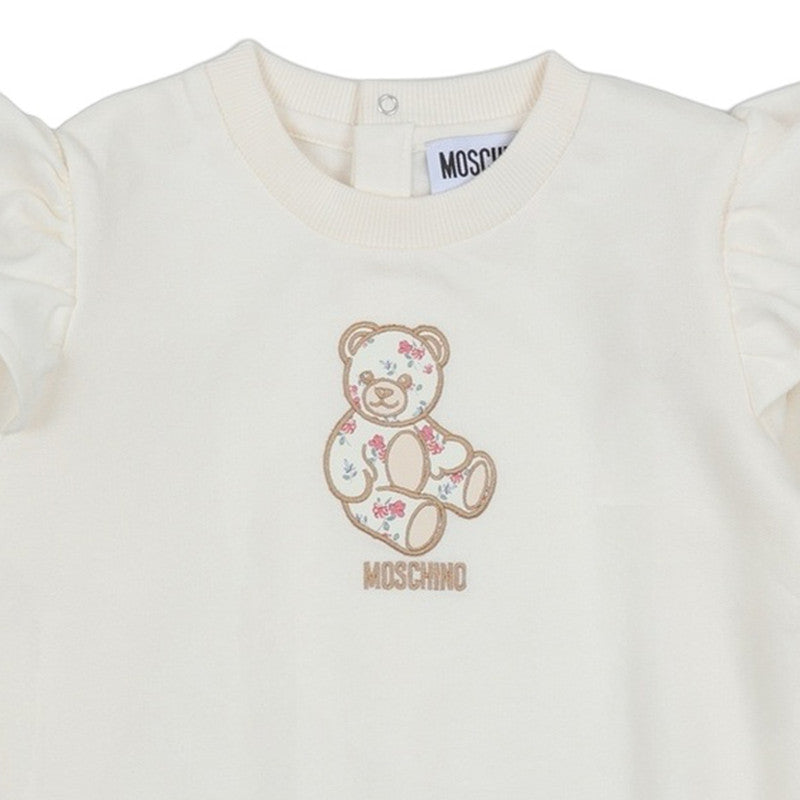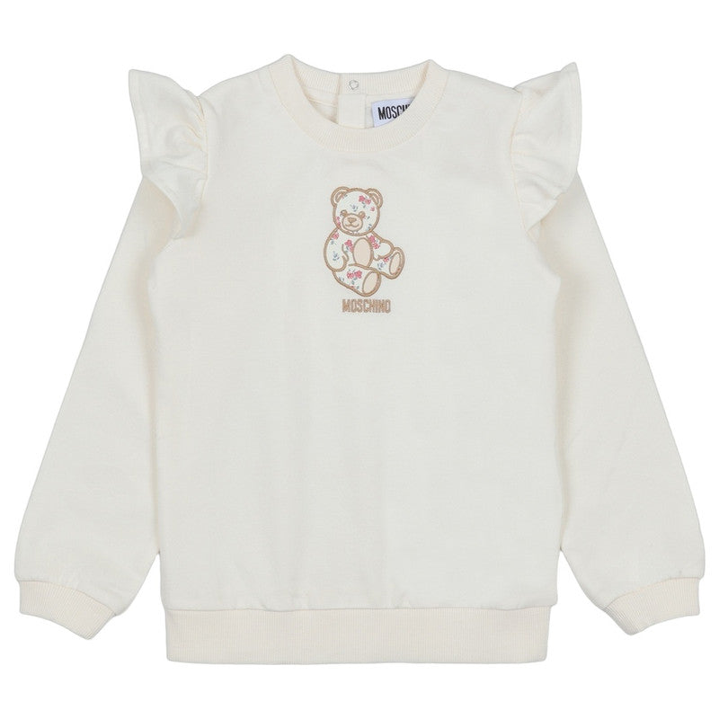 This Charming White Sweatshirt From Moschino Is A Sweet And Stylish Addition To Any Little One'S Wardrobe. It Features A Unique Floral-Print Teddy Bear Motif On The Chest, Adding A Whimsical Touch. The Sweatshirt Has Ruffle Details On The Shoulders, Long Sleeves, And Ribbed Cuffs For A Snug Fit. A Snap-Button Closure On The Shoulder Makes Dressing A Breeze. Made From A Soft Cotton Blend, It'S Perfect For Keeping Cozy And Looking Cute.