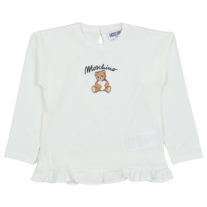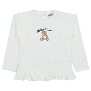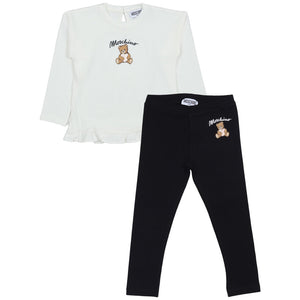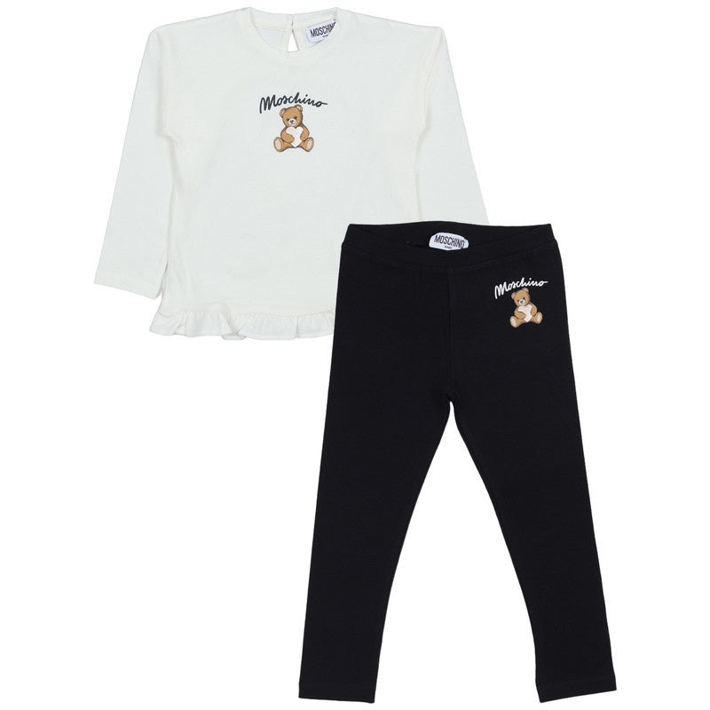 Moschino Kids Pink Teddy-Print Ruffled Tracksuit Featuring A Long-Sleeve Top With Playful Ruffled Hem And Teddy-Bear Motif, Paired With White Leggings. Finished With An Elasticated Waistband For Comfort And Ease Of Movement.