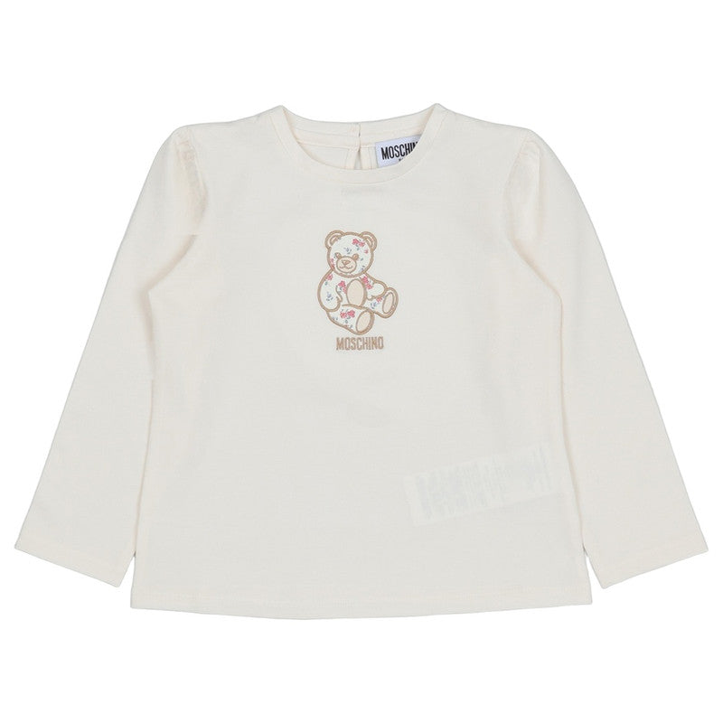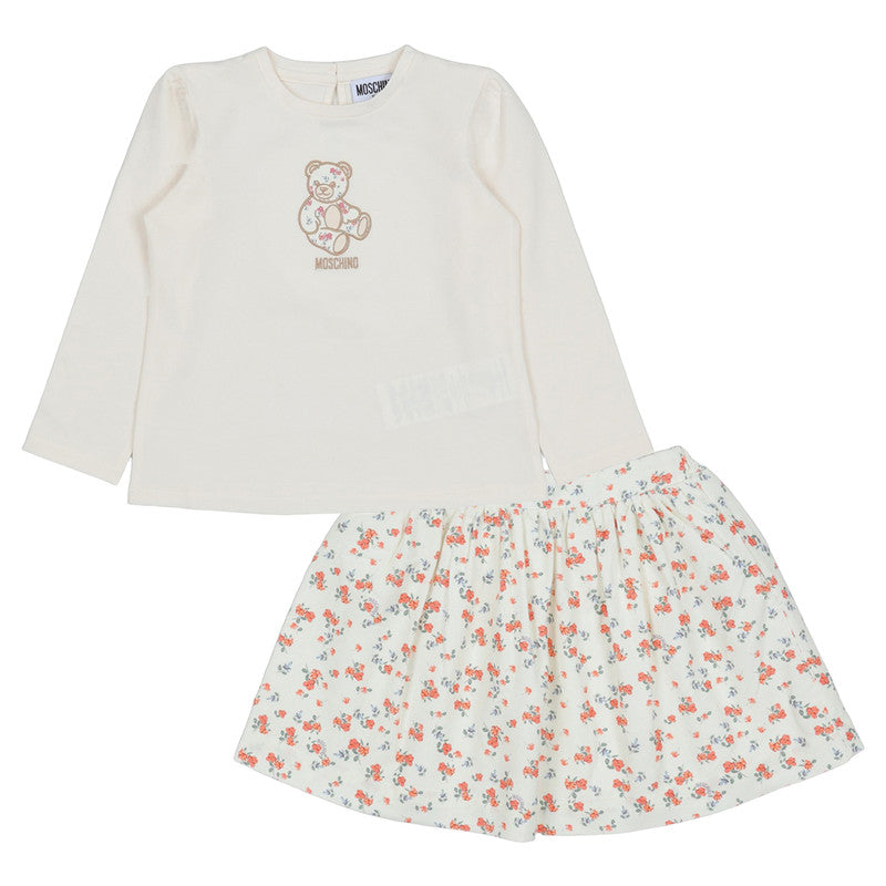 This Moschino Kids Outfit In Off-White Features A Soft Jersey Texture. The T-Shirt Showcases A Playful Bear Embroidery And Back Button Fastening, While The Skirt Has An Elasticated Waistband With A Charming Floral Print, All In Comfortable Cotton.