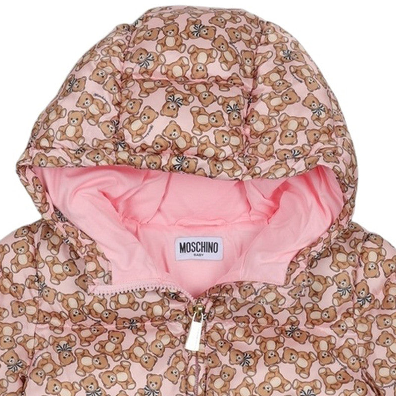 This Adorable Pink Puffer Jacket From Moschino Is A Warm And Playful Choice For Cooler Weather. It Features A Charming, All-Over Print Of The Brand'S Iconic Teddy Bear Motif, Adding A Whimsical Touch To Any Outfit. The Jacket Includes A Cozy Hood, A Full-Zip Front, And Two Gold-Toned Snap Buttons At The Bottom. The Interior Is Lined With A Smooth, Solid Pink Fabric. This Stylish And Comfortable Jacket Is Perfect For Keeping Your Little One Warm On Chilly Days.