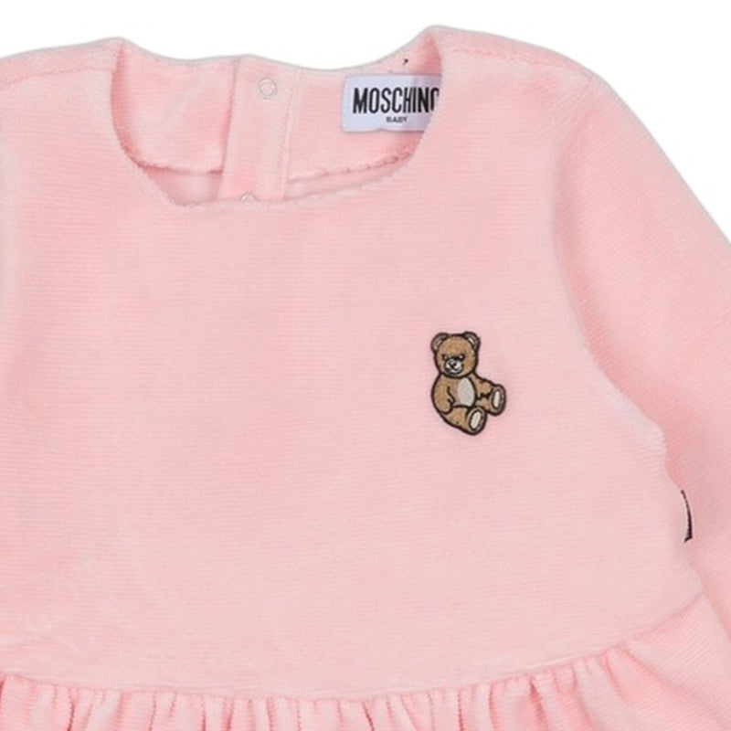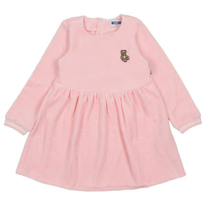 This Charming Light Pink Moschino Baby Dress Is Crafted From Soft Velvet And Features A Full, Flared Skirt With Gathering At The Waist, Ribbed Cuffs, And A Delicate Teddy Bear Applique On The Chest.