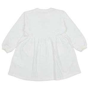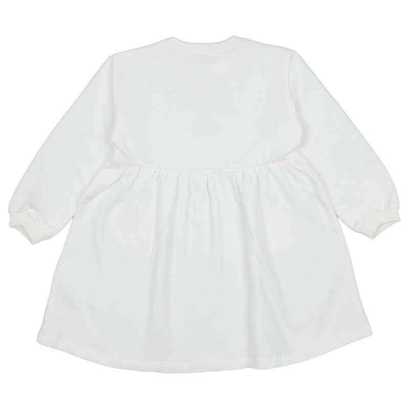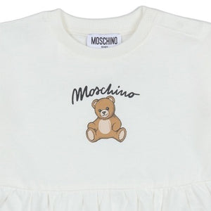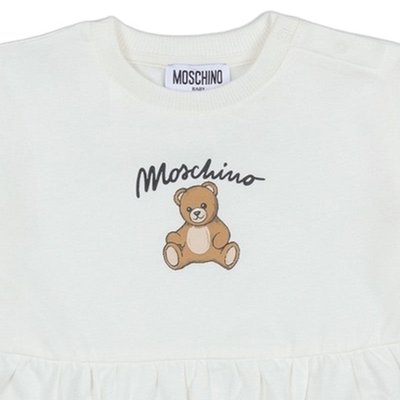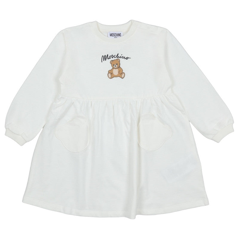 This Charming White Dress From Moschino Is A Comfortable And Stylish Piece For Any Little One. Made From Soft Jersey Cotton, It Features A Sweet Teddy Bear Print And "Moschino" Logo On The Chest. The Dress Has Long Sleeves With Ribbed Cuffs And A Cute Drop-Waist Design With Two Adorable Heart-Shaped Pockets. A Snap-Button Closure On The Shoulder Makes For Easy Dressing. This Dress Is Perfect For Both Casual Wear And Special Occasions.
