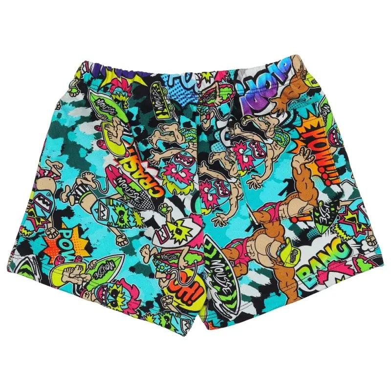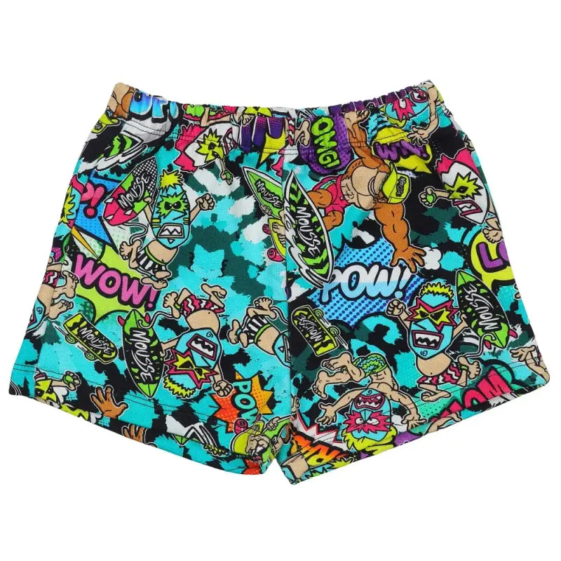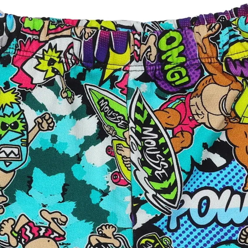 These are vibrant and energetic shorts from the Mousse kids' brand. They feature an all-over, comic-inspired print with bold colors, cartoon characters, action words like "POW!" and "WOW!", and the Mousse logo incorporated into the design.