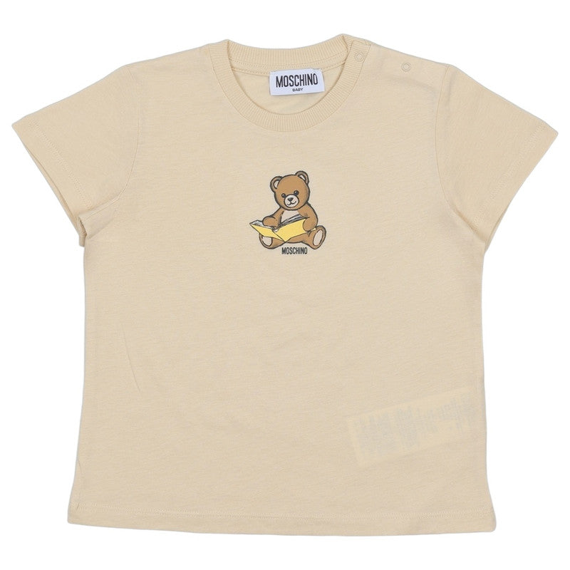 This Adorable Beige T-Shirt From Moschino Is A Sweet And Comfortable Everyday Piece. Made From Soft Cotton, It Features A Playful Graphic Of The Brand'S Iconic Teddy Bear Reading A Yellow Book. The Classic Crew Neck And Short Sleeves Offer A Relaxed Fit, And A Snap-Button Closure On The Shoulder Makes Dressing Easy. It'S A Charming And Versatile Top Perfect For Any Casual Occasion.