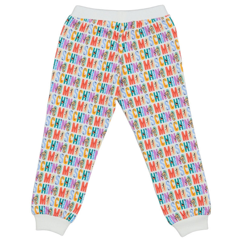 This Adorable Moschino Kids Tracksuit Includes A White Sweatshirt With A Colorful Logo Print And Matching Joggers Featuring A Vibrant All-Over Logo And Bear Motif.