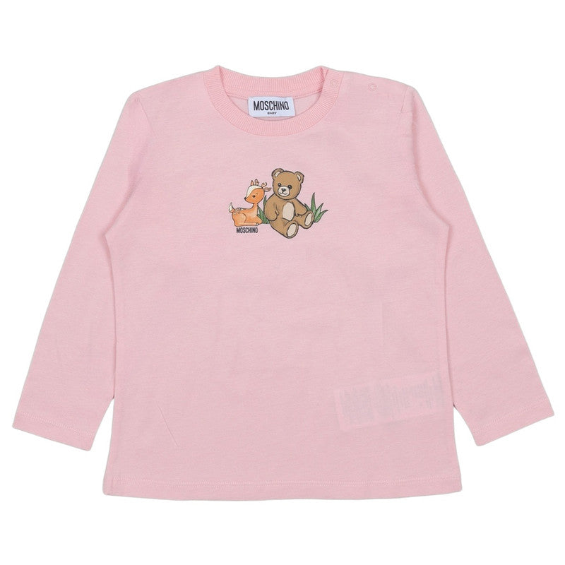 This Charming Light Pink Long-Sleeve T-Shirt From Moschino Kids Is A Sweet And Comfortable Addition To Any Wardrobe. Made From A Soft Cotton Blend, It Features A Playful Graphic Of The Brand'S Signature Teddy Bear Sitting Beside A Deer. The Classic Crew Neck And Long Sleeves Make It Perfect For Layering, While The Snap-Button Closure On The Shoulder Ensures Easy Dressing.