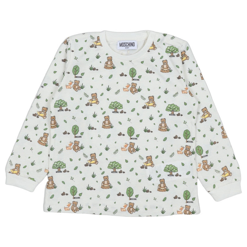 This Adorable Moschino Tracksuit Set Is Perfect For Both Playtime And Naptime. The Soft, Long-Sleeve Top Features An All-Over Forest Print With Cute Teddy Bears And Trees, While The Matching White Joggers Have A Single Bear Motif On The Leg. With An Elasticated Waistband And Ribbed Cuffs, This Set Ensures A Comfortable And Secure Fit. Made From A Breathable Cotton Blend, It’S A Cozy Choice For Your Little One.