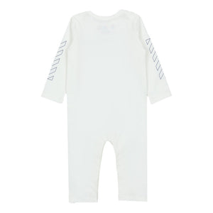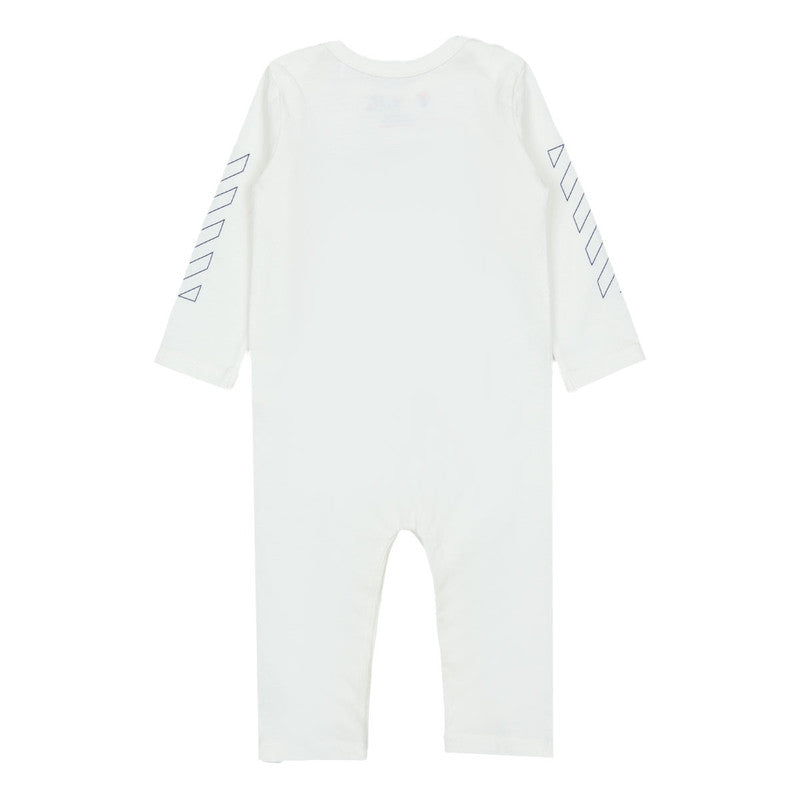 This adorable Off-White set, featuring a onesie, hat, and bib in crisp white with a blue logo, is the perfect premium gift for a fashion-forward newborn.