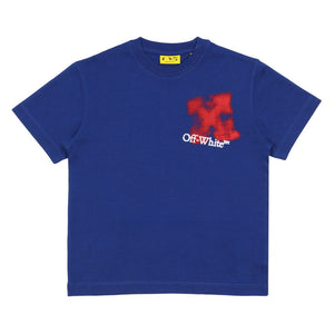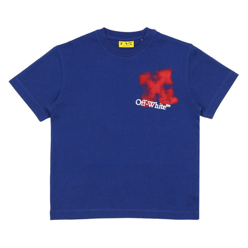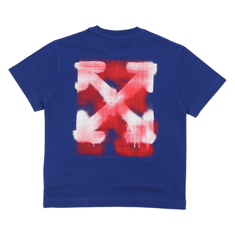 Blue cotton T-shirt by Off-White, with a large yellow spray-paint arrows logo on the back. Soft and comfortable, this casual tee features a faded logo on the chest for a distinctive finish.
