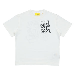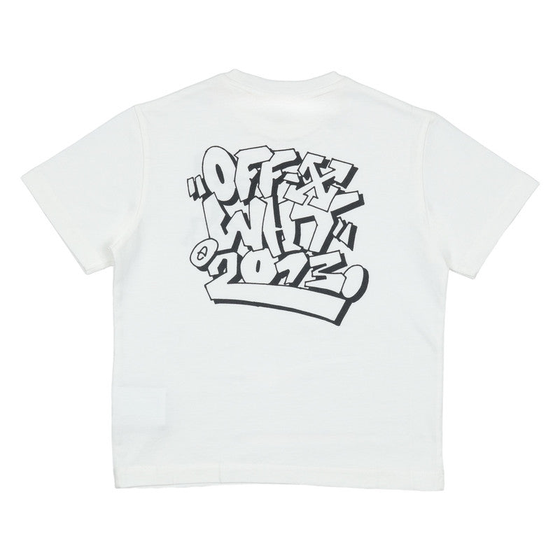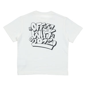 White cotton T-shirt by Off-White, featuring a bold graffiti-style logo print on the back. Cool and casual, it features a smaller 3D-style arrow graphic on the front for instant brand recognition.