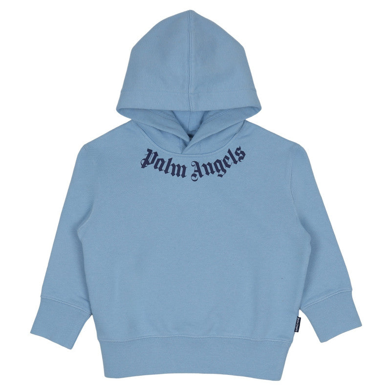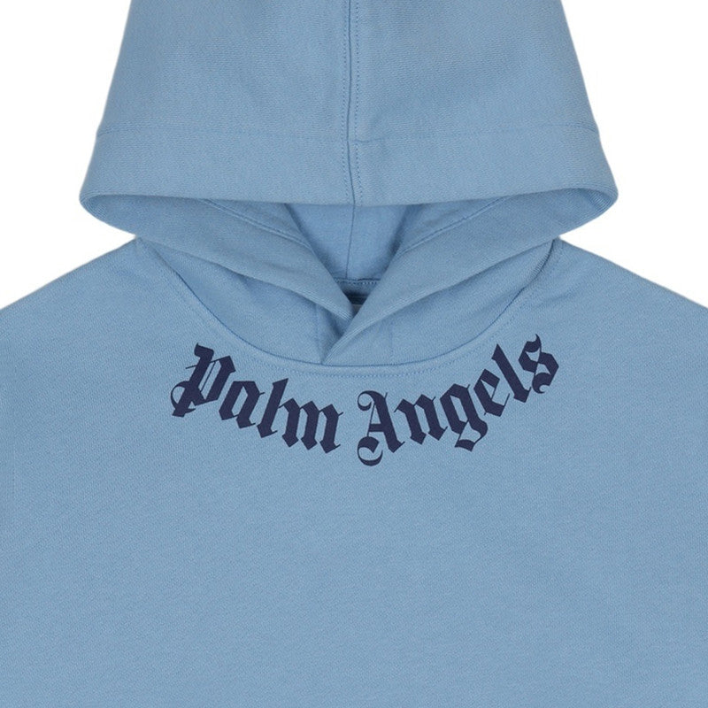 Wrap them in cool color and iconic style. This light blue Palm Angels kids' hoodie in soft cotton featuring a bold neck logo and ribbed hem. It's the perfect statement piece for comfort and luxury streetwear.