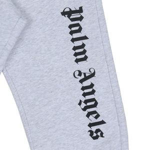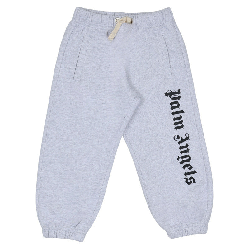 Light grey marl joggers by Palm Angels, made in soft cotton jersey. Casual and comfortable, they have side seam pockets and a drawstring waist for a great fit. The brand's iconic Old English-style logo is printed in black on one leg for a statement finish.