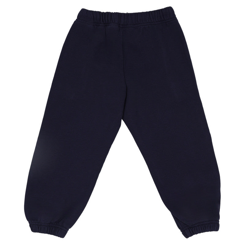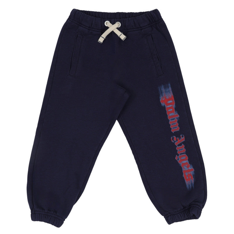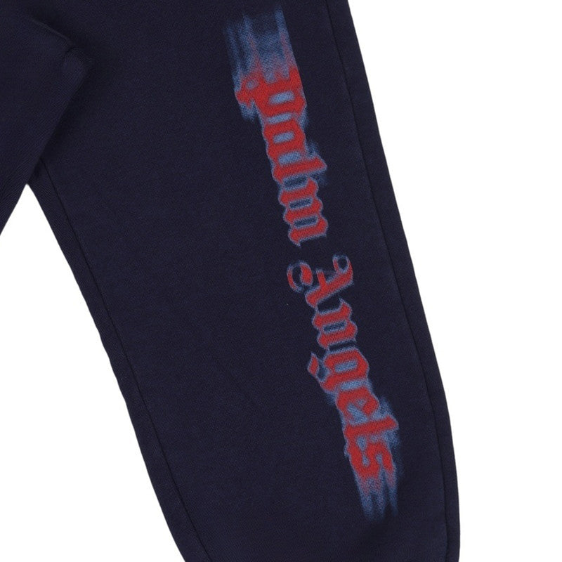 These navy Palm Angels kids' sweatpants feature an elastic waist, cuffed ankles, and a striking vertical blurred logo print down the leg.