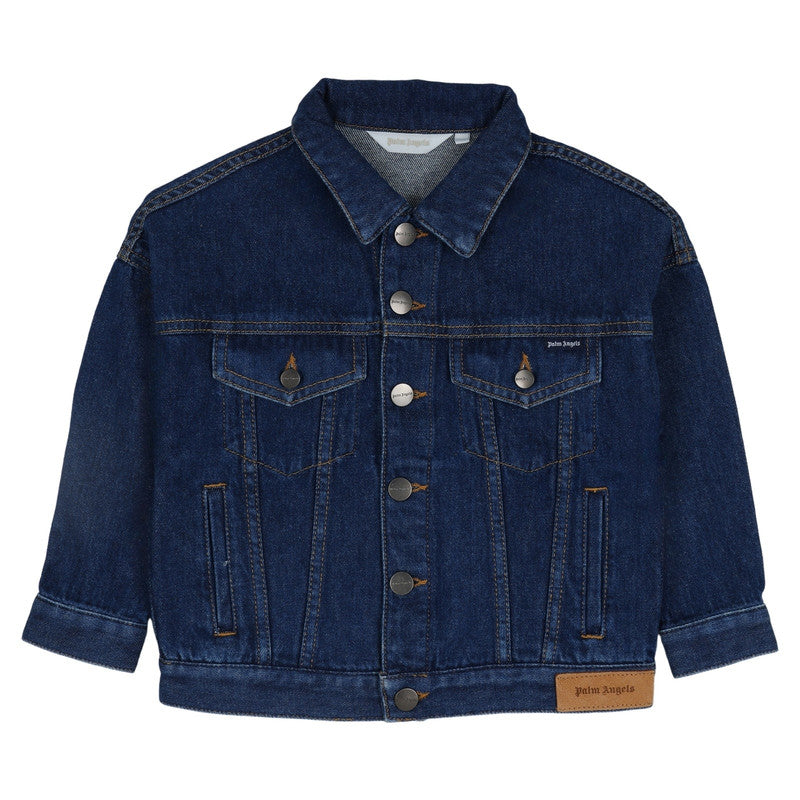 Structured denim jacket with iconic logo detailing, featuring a timeless silhouette and buttoned front closure.